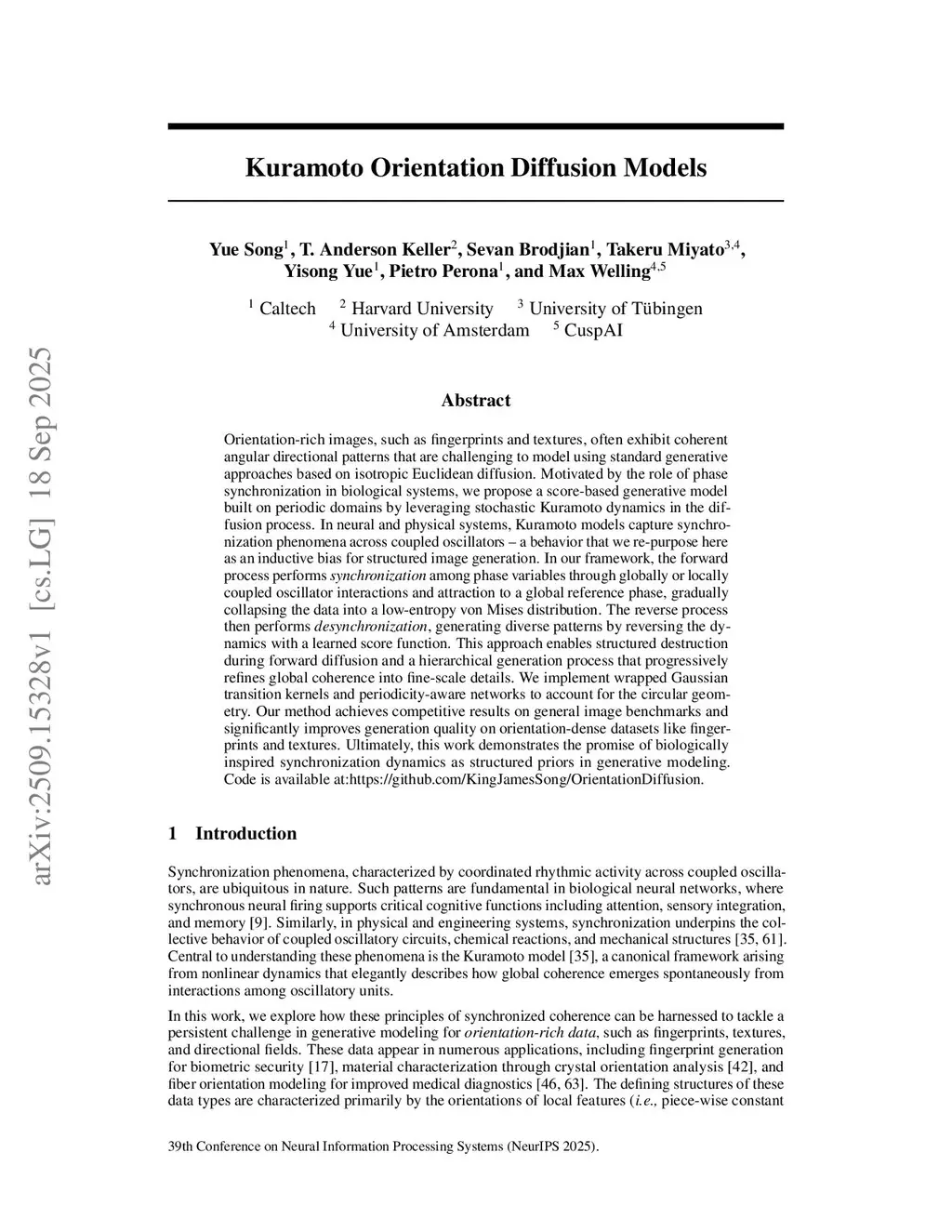 Orientation-rich images, such as fingerprints and textures, often exhibit coherent angular directional patterns that are challenging to model using standard generative approaches based on isotropic Euclidean diffusion. Motivated by the role of phase synchronization in biological systems, we propose a score-based generative model built on periodic domains by leveraging stochastic Kuramoto dynamics in the diffusion process. In neural and physical systems, Kuramoto models capture synchronization phenomena across coupled oscillators -- a behavior that we re-purpose here as an inductive bias for structured image generation. In our framework, the forward process performs \textit{synchronization} among phase variables through globally or locally coupled oscillator interactions and attraction to a global reference phase, gradually collapsing the data into a low-entropy von Mises distribution. The reverse process then performs \textit{desynchronization}, generating diverse patterns by reversing the dynamics with a learned score function. This approach enables structured destruction during forward diffusion and a hierarchical generation process that progressively refines global coherence into fine-scale details. We implement wrapped Gaussian transition kernels and periodicity-aware networks to account for the circular geometry. Our method achieves competitive results on general image benchmarks and significantly improves generation quality on orientation-dense datasets like fingerprints and textures. Ultimately, this work demonstrates the promise of biologically inspired synchronization dynamics as structured priors in generative modeling.