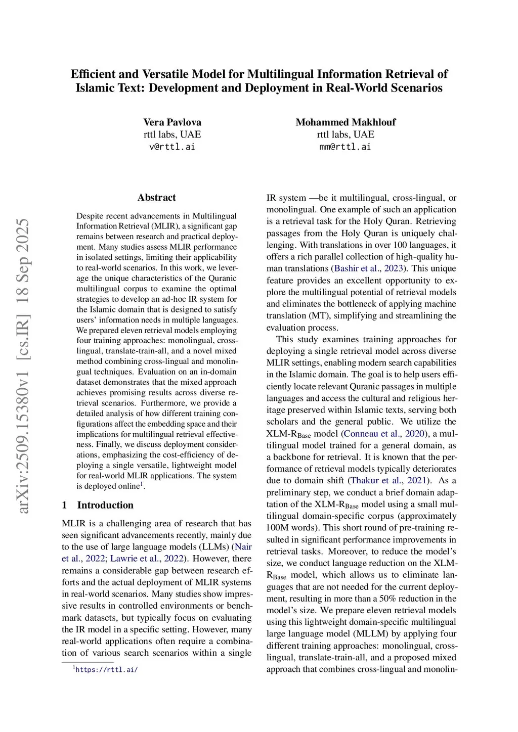 Efficient and Versatile Model for Multilingual Information Retrieval of Islamic Text: Development and Deployment in Real-World Scenarios