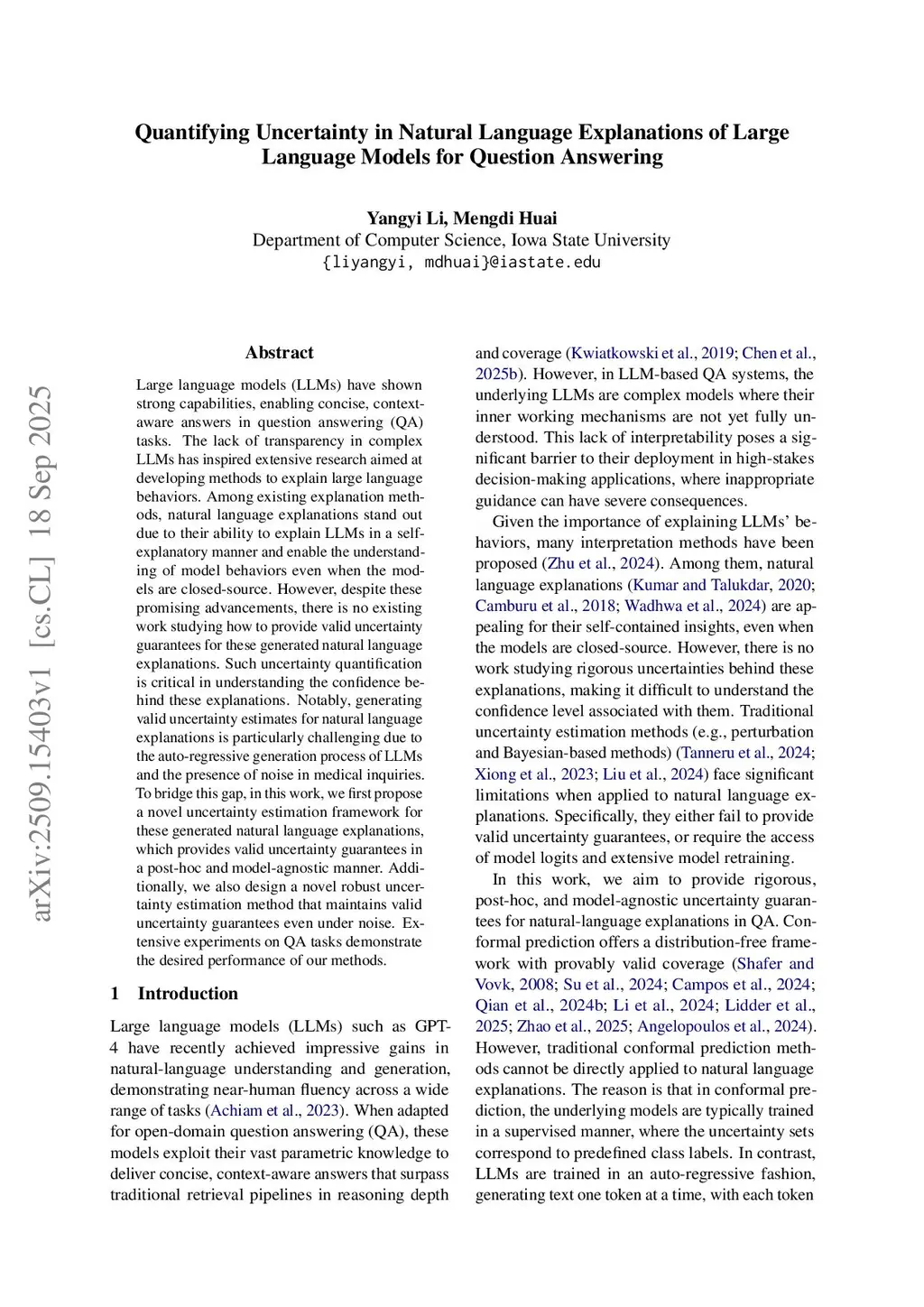 Quantifying Uncertainty in Natural Language Explanations of Large Language Models for Question Answering