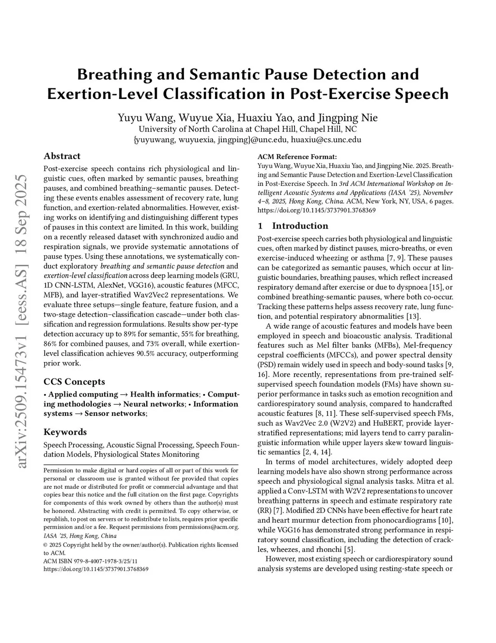 Breathing and Semantic Pause Detection and Exertion-Level Classification in Post-Exercise Speech