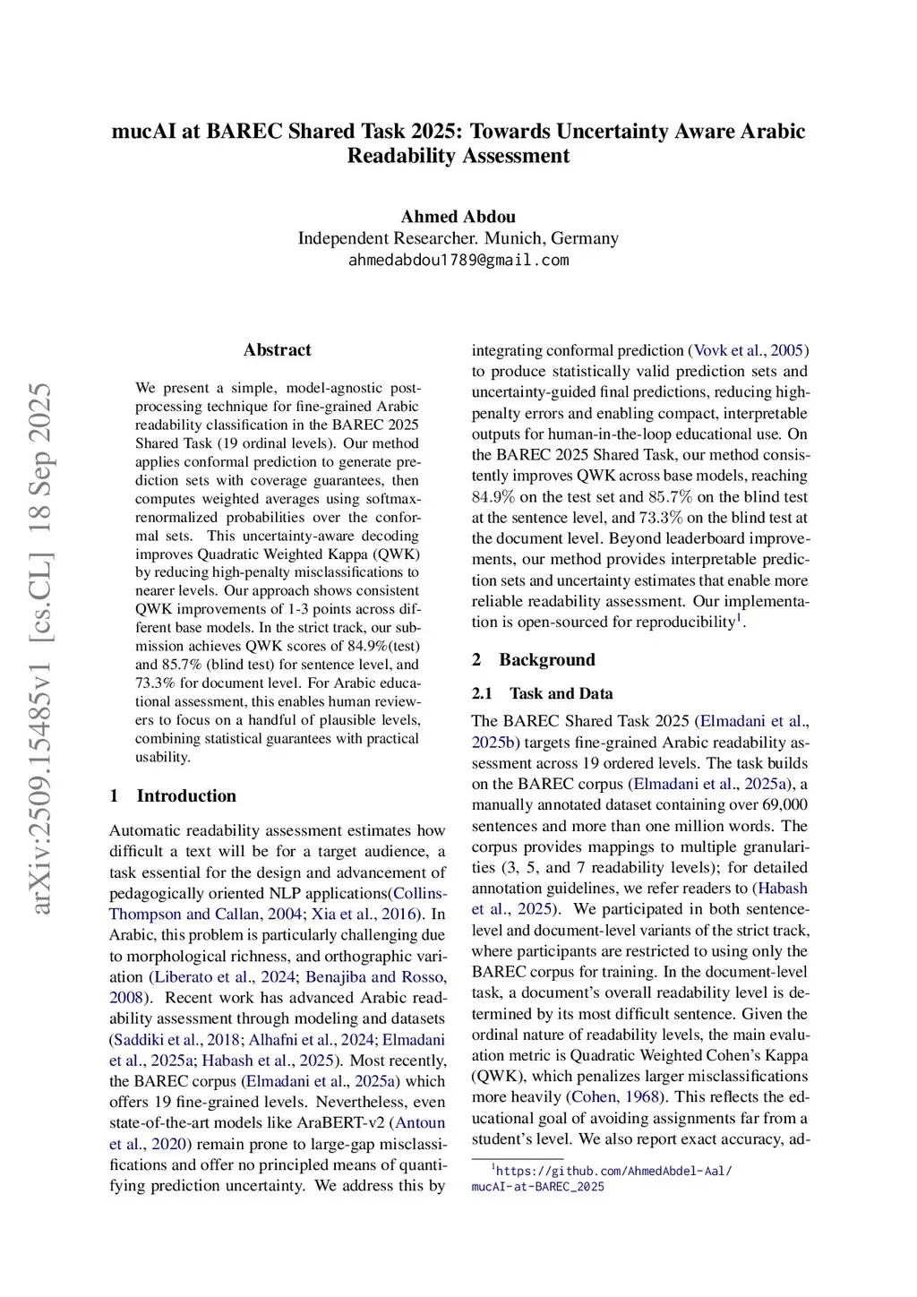 We present a simple, model-agnostic post-processing technique for fine-grained Arabic readability classification in the BAREC 2025 Shared Task (19 ordinal levels). Our method applies conformal prediction to generate prediction sets with coverage guarantees, then computes weighted averages using softmax-renormalized probabilities over the conformal sets. This uncertainty-aware decoding improves Quadratic Weighted Kappa (QWK) by reducing high-penalty misclassifications to nearer levels. Our approach shows consistent QWK improvements of 1-3 points across different base models. In the strict track, our submission achieves QWK scores of 84.9\%(test) and 85.7\% (blind test) for sentence level, and 73.3\% for document level. For Arabic educational assessment, this enables human reviewers to focus on a handful of plausible levels, combining statistical guarantees with practical usability.
