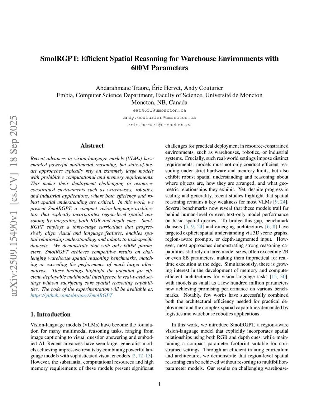 Recent advances in vision-language models (VLMs) have enabled powerful multimodal reasoning, but state-of-the-art approaches typically rely on extremely large models with prohibitive computational and memory requirements. This makes their deployment challenging in resource-constrained environments such as warehouses, robotics, and industrial applications, where both efficiency and robust spatial understanding are critical. In this work, we present SmolRGPT, a compact vision-language architecture that explicitly incorporates region-level spatial reasoning by integrating both RGB and depth cues. SmolRGPT employs a three-stage curriculum that progressively align visual and language features, enables spatial relationship understanding, and adapts to task-specific datasets. We demonstrate that with only 600M parameters, SmolRGPT achieves competitive results on challenging warehouse spatial reasoning benchmarks, matching or exceeding the performance of much larger alternatives. These findings highlight the potential for efficient, deployable multimodal intelligence in real-world settings without sacrificing core spatial reasoning capabilities. The code of the experimentation will be available at:this https URL