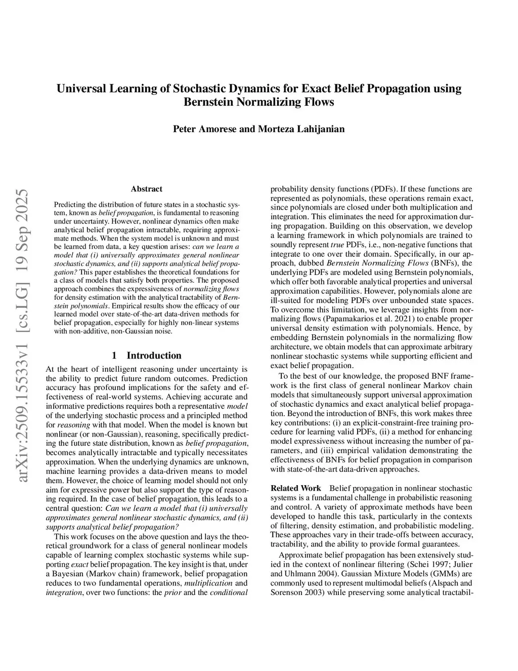 Predicting the distribution of future states in a stochastic system, known as belief propagation, is fundamental to reasoning under uncertainty. However, nonlinear dynamics often make analytical belief propagation intractable, requiring approximate methods. When the system model is unknown and must be learned from data, a key question arises: can we learn a model that (i) universally approximates general nonlinear stochastic dynamics, and (ii) supports analytical belief propagation? This paper establishes the theoretical foundations for a class of models that satisfy both properties. The proposed approach combines the expressiveness of normalizing flows for density estimation with the analytical tractability of Bernstein polynomials. Empirical results show the efficacy of our learned model over state-of-the-art data-driven methods for belief propagation, especially for highly non-linear systems with non-additive, non-Gaussian noise.