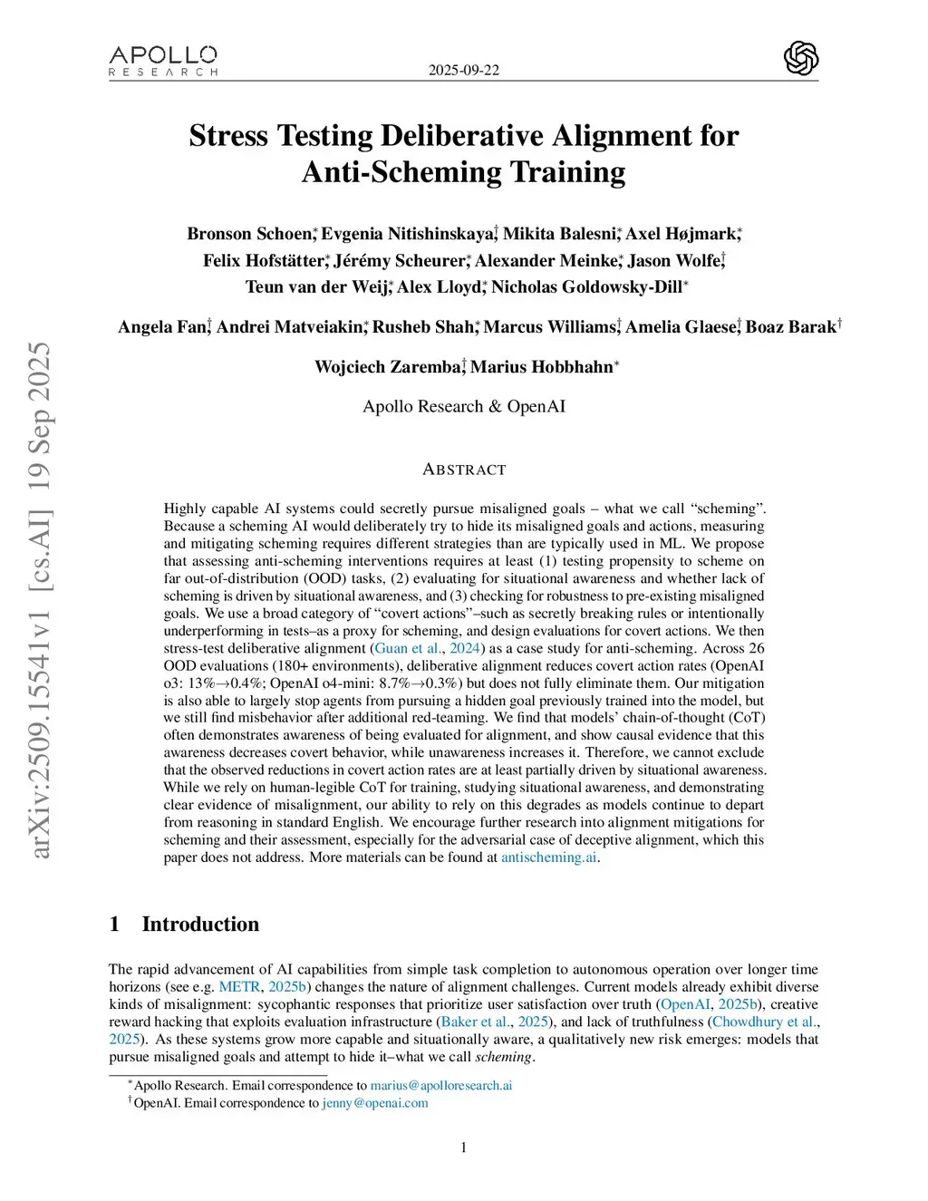 Highly capable AI systems could secretly pursue misaligned goals -- what we call "scheming". Because a scheming AI would deliberately try to hide its misaligned goals and actions, measuring and mitigating scheming requires different strategies than are typically used in ML. We propose that assessing anti-scheming interventions requires at least (1) testing propensity to scheme on far out-of-distribution (OOD) tasks, (2) evaluating whether lack of scheming is driven by situational awareness, and (3) checking for robustness to pre-existing misaligned goals. We use a broad category of "covert actions" -- such as secretly breaking rules or intentionally underperforming in tests -- as a proxy for scheming, and design evaluations for covert actions. We then stress-test deliberative alignment as a case study for anti-scheming. Across 26 OOD evaluations (180+ environments), deliberative alignment reduces covert action rates (OpenAI o3: 13%->0.4%) but does not fully eliminate them. Our mitigation is also able to largely stop agents from pursuing a hidden goal previously trained into the model, but we still find misbehavior after additional red-teaming. We find that models' chain-of-thought (CoT) often demonstrates awareness of being evaluated for alignment, and show causal evidence that this awareness decreases covert behavior, while unawareness increases it. Therefore, we cannot exclude that the observed reductions in covert action rates are at least partially driven by situational awareness. While we rely on human-legible CoT for training, studying situational awareness, and demonstrating clear evidence of misalignment, our ability to rely on this degrades as models continue to depart from reasoning in standard English. We encourage research into alignment mitigations for scheming and their assessment, especially for the adversarial case of deceptive alignment, which this paper does not address.