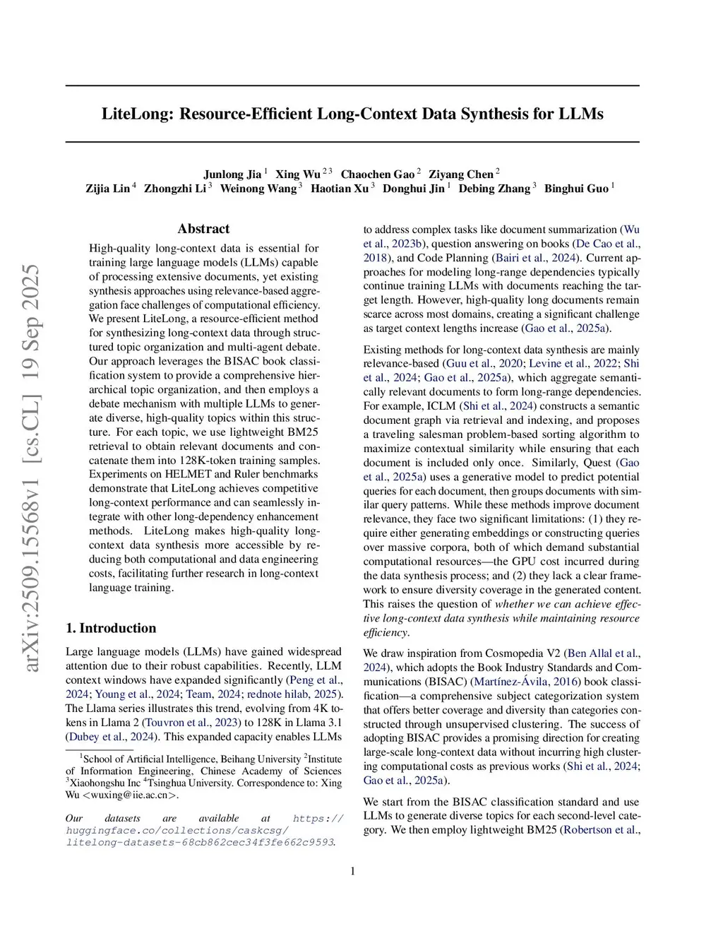 High-quality long-context data is essential for training large language models (LLMs) capable of processing extensive documents, yet existing synthesis approaches using relevance-based aggregation face challenges of computational efficiency. We present LiteLong, a resource-efficient method for synthesizing long-context data through structured topic organization and multi-agent debate. Our approach leverages the BISAC book classification system to provide a comprehensive hierarchical topic organization, and then employs a debate mechanism with multiple LLMs to generate diverse, high-quality topics within this structure. For each topic, we use lightweight BM25 retrieval to obtain relevant documents and concatenate them into 128K-token training samples. Experiments on HELMET and Ruler benchmarks demonstrate that LiteLong achieves competitive long-context performance and can seamlessly integrate with other long-dependency enhancement methods. LiteLong makes high-quality long-context data synthesis more accessible by reducing both computational and data engineering costs, facilitating further research in long-context language training.