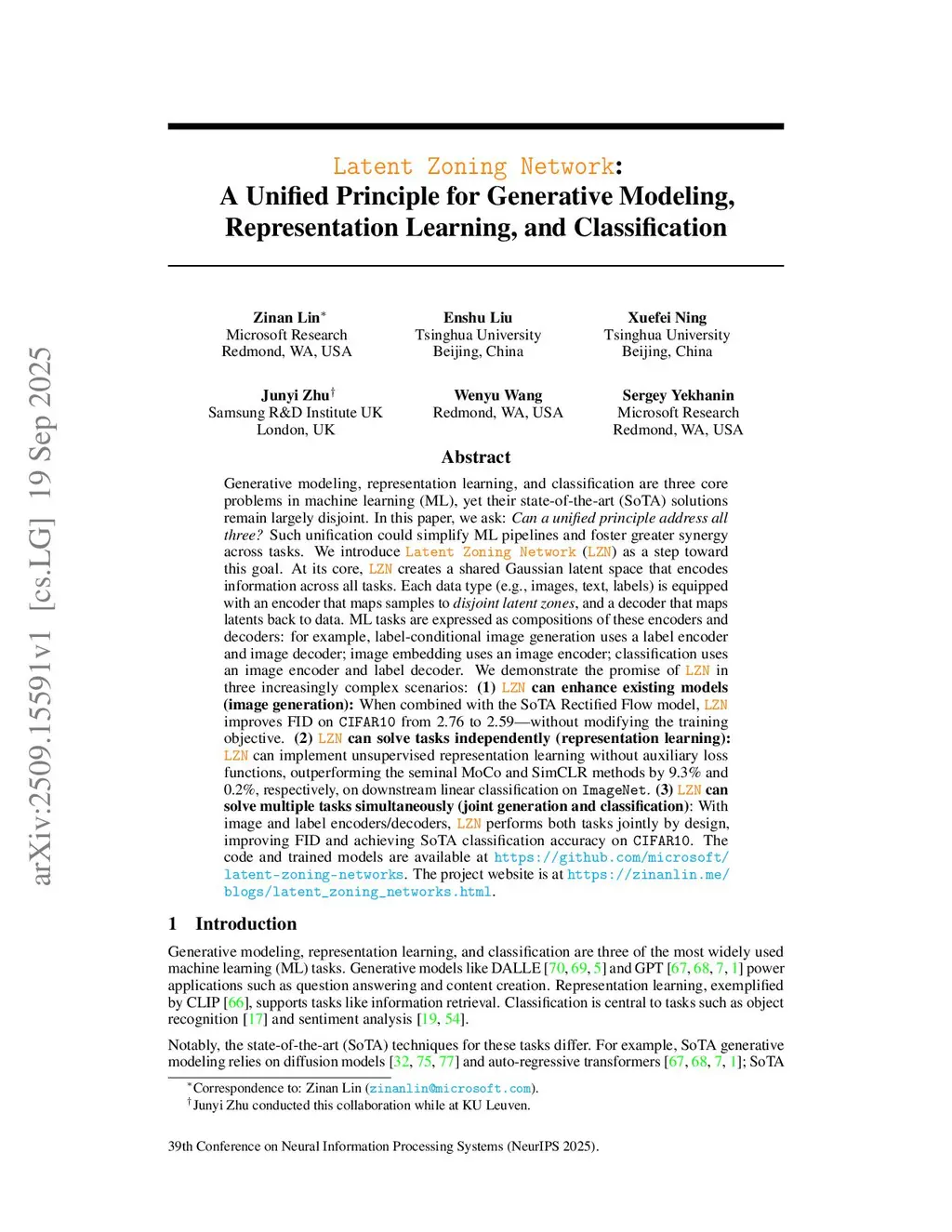 Generative modeling, representation learning, and classification are three core problems in machine learning (ML), yet their state-of-the-art (SoTA) solutions remain largely disjoint. In this paper, we ask: Can a unified principle address all three? Such unification could simplify ML pipelines and foster greater synergy across tasks. We introduce Latent Zoning Network (LZN) as a step toward this goal. At its core, LZN creates a shared Gaussian latent space that encodes information across all tasks. Each data type (e.g., images, text, labels) is equipped with an encoder that maps samples to disjoint latent zones, and a decoder that maps latents back to data. ML tasks are expressed as compositions of these encoders and decoders: for example, label-conditional image generation uses a label encoder and image decoder; image embedding uses an image encoder; classification uses an image encoder and label decoder. We demonstrate the promise of LZN in three increasingly complex scenarios: (1) LZN can enhance existing models (image generation): When combined with the SoTA Rectified Flow model, LZN improves FID on CIFAR10 from 2.76 to 2.59-without modifying the training objective. (2) LZN can solve tasks independently (representation learning): LZN can implement unsupervised representation learning without auxiliary loss functions, outperforming the seminal MoCo and SimCLR methods by 9.3% and 0.2%, respectively, on downstream linear classification on ImageNet. (3) LZN can solve multiple tasks simultaneously (joint generation and classification): With image and label encoders/decoders, LZN performs both tasks jointly by design, improving FID and achieving SoTA classification accuracy on CIFAR10. The code and trained models are available at this https URL. The project website is at this https URL.