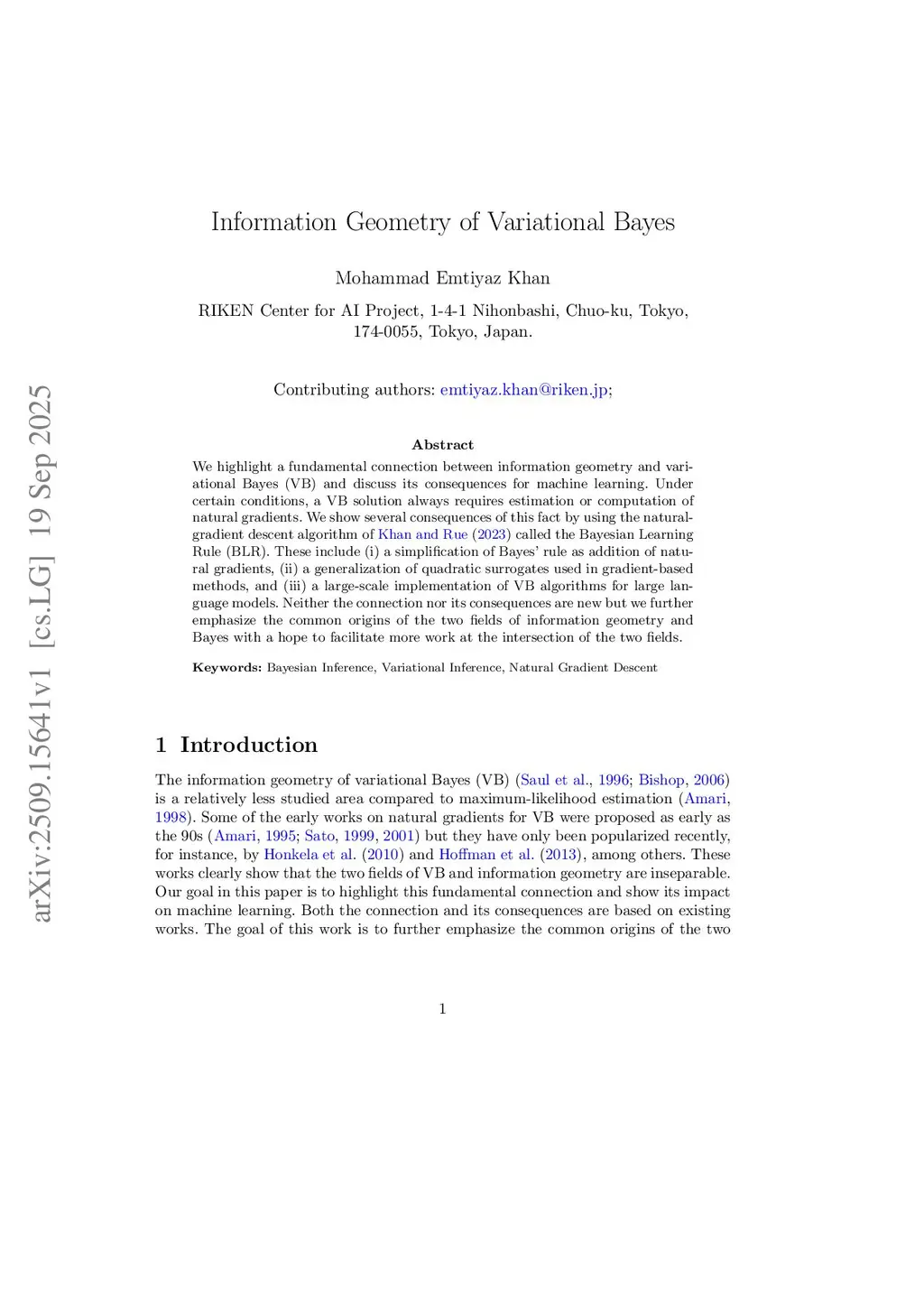 We highlight a fundamental connection between information geometry and variational Bayes (VB) and discuss its consequences for machine learning. Under certain conditions, a VB solution always requires estimation or computation of natural gradients. We show several consequences of this fact by using the natural-gradient descent algorithm of Khan and Rue (2023) called the Bayesian Learning Rule (BLR). These include (i) a simplification of Bayes' rule as addition of natural gradients, (ii) a generalization of quadratic surrogates used in gradient-based methods, and (iii) a large-scale implementation of VB algorithms for large language models. Neither the connection nor its consequences are new but we further emphasize the common origins of the two fields of information geometry and Bayes with a hope to facilitate more work at the intersection of the two fields.