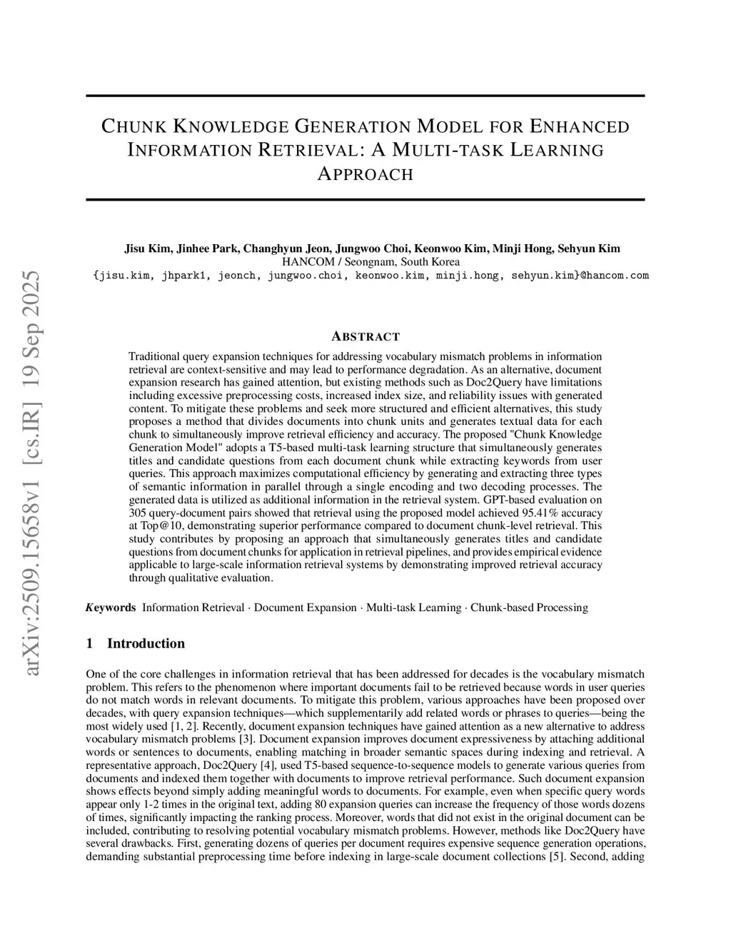 Traditional query expansion techniques for addressing vocabulary mismatch problems in information retrieval are context-sensitive and may lead to performance degradation. As an alternative, document expansion research has gained attention, but existing methods such as Doc2Query have limitations including excessive preprocessing costs, increased index size, and reliability issues with generated content. To mitigate these problems and seek more structured and efficient alternatives, this study proposes a method that divides documents into chunk units and generates textual data for each chunk to simultaneously improve retrieval efficiency and accuracy. The proposed "Chunk Knowledge Generation Model" adopts a T5-based multi-task learning structure that simultaneously generates titles and candidate questions from each document chunk while extracting keywords from user queries. This approach maximizes computational efficiency by generating and extracting three types of semantic information in parallel through a single encoding and two decoding processes. The generated data is utilized as additional information in the retrieval system. GPT-based evaluation on 305 query-document pairs showed that retrieval using the proposed model achieved 95.41% accuracy at Top@10, demonstrating superior performance compared to document chunk-level retrieval. This study contributes by proposing an approach that simultaneously generates titles and candidate questions from document chunks for application in retrieval pipelines, and provides empirical evidence applicable to large-scale information retrieval systems by demonstrating improved retrieval accuracy through qualitative evaluation.