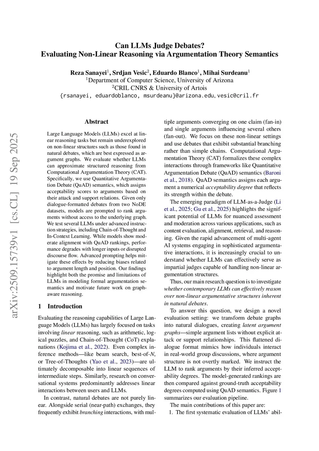Large Language Models (LLMs) excel at linear reasoning tasks but remain underexplored on non-linear structures such as those found in natural debates, which are best expressed as argument graphs. We evaluate whether LLMs can approximate structured reasoning from Computational Argumentation Theory (CAT). Specifically, we use Quantitative Argumentation Debate (QuAD) semantics, which assigns acceptability scores to arguments based on their attack and support relations. Given only dialogue-formatted debates from two NoDE datasets, models are prompted to rank arguments without access to the underlying graph. We test several LLMs under advanced instruction strategies, including Chain-of-Thought and In-Context Learning. While models show moderate alignment with QuAD rankings, performance degrades with longer inputs or disrupted discourse flow. Advanced prompting helps mitigate these effects by reducing biases related to argument length and position. Our findings highlight both the promise and limitations of LLMs in modeling formal argumentation semantics and motivate future work on graph-aware reasoning.