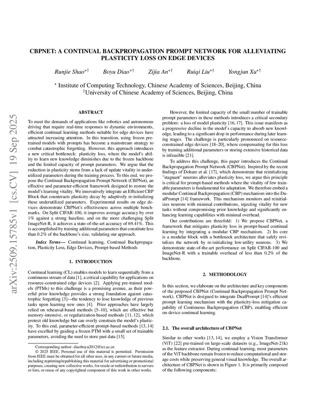 CBPNet: A Continual Backpropagation Prompt Network for Alleviating Plasticity Loss on Edge Devices