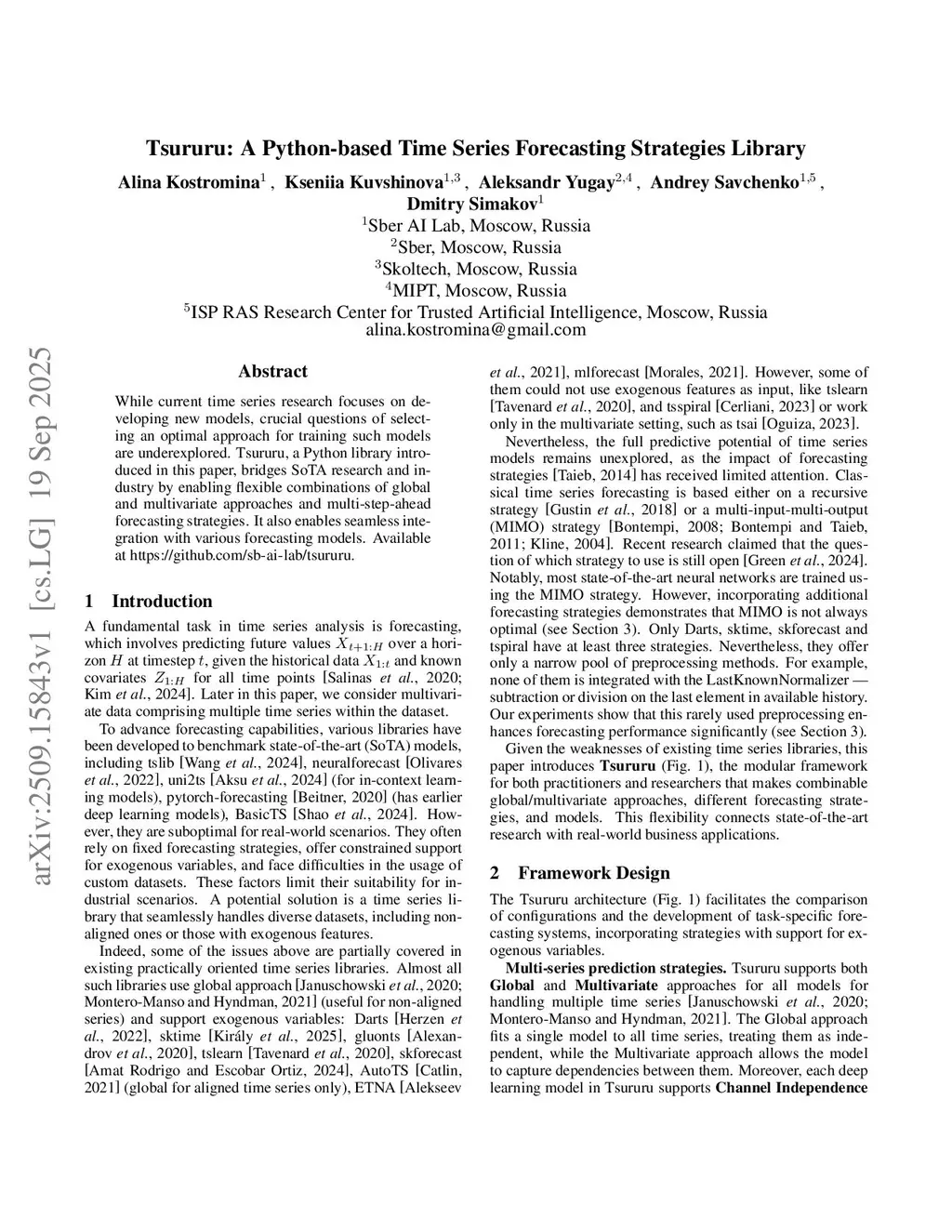 While current time series research focuses on developing new models, crucial questions of selecting an optimal approach for training such models are underexplored. Tsururu, a Python library introduced in this paper, bridges SoTA research and industry by enabling flexible combinations of global and multivariate approaches and multi-step-ahead forecasting strategies. It also enables seamless integration with various forecasting models. Available atthis https URL.