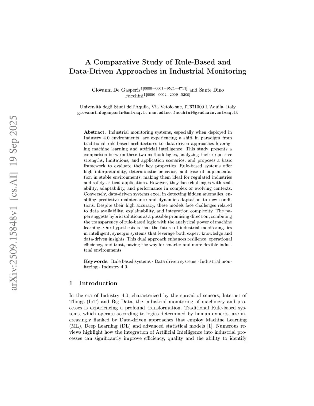 Industrial monitoring systems, especially when deployed in Industry 4.0 environments, are experiencing a shift in paradigm from traditional rule-based architectures to data-driven approaches leveraging machine learning and artificial intelligence. This study presents a comparison between these two methodologies, analyzing their respective strengths, limitations, and application scenarios, and proposes a basic framework to evaluate their key properties. Rule-based systems offer high interpretability, deterministic behavior, and ease of implementation in stable environments, making them ideal for regulated industries and safety-critical applications. However, they face challenges with scalability, adaptability, and performance in complex or evolving contexts. Conversely, data-driven systems excel in detecting hidden anomalies, enabling predictive maintenance and dynamic adaptation to new conditions. Despite their high accuracy, these models face challenges related to data availability, explainability, and integration complexity. The paper suggests hybrid solutions as a possible promising direction, combining the transparency of rule-based logic with the analytical power of machine learning. Our hypothesis is that the future of industrial monitoring lies in intelligent, synergic systems that leverage both expert knowledge and data-driven insights. This dual approach enhances resilience, operational efficiency, and trust, paving the way for smarter and more flexible industrial environments.