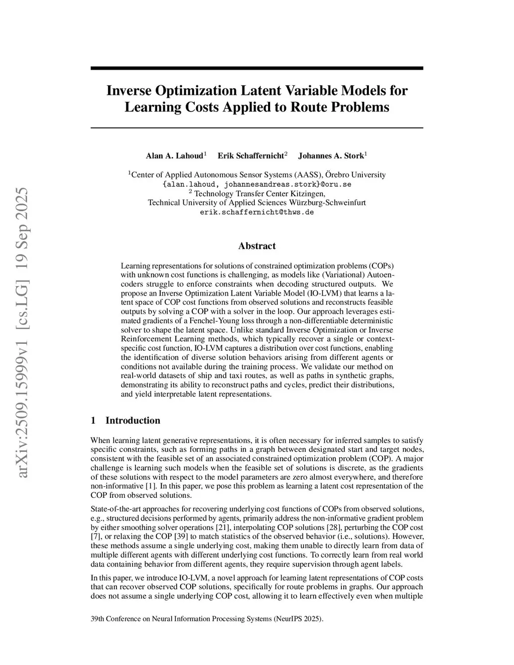 Inverse Optimization Latent Variable Models for Learning Costs Applied to Route Problems