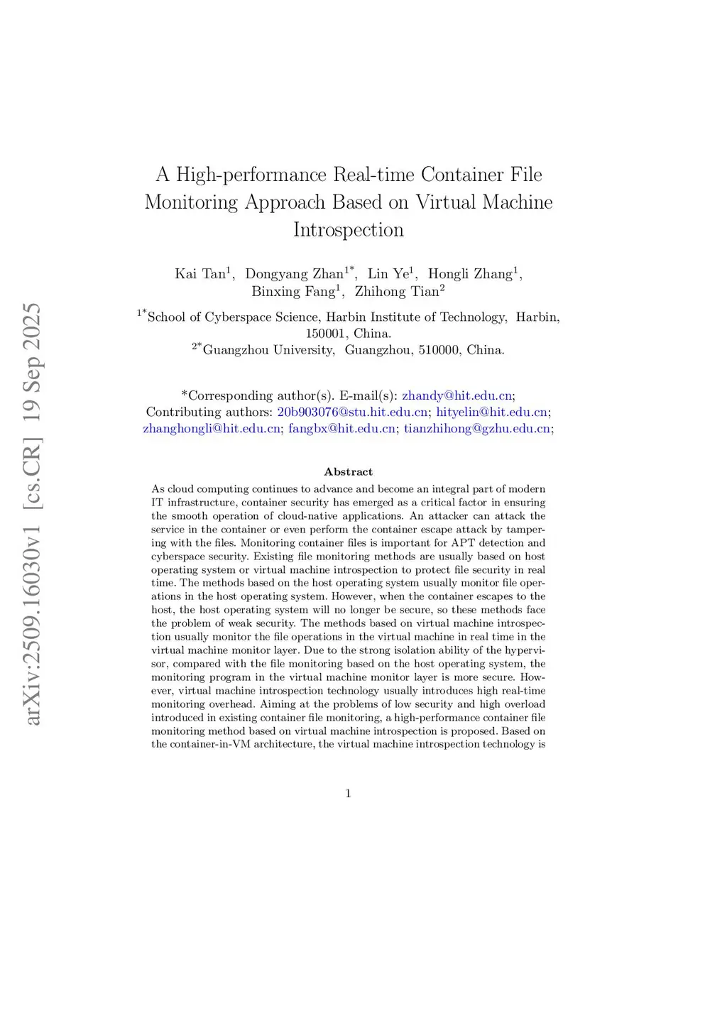 A High-performance Real-time Container File Monitoring Approach Based on Virtual Machine Introspection