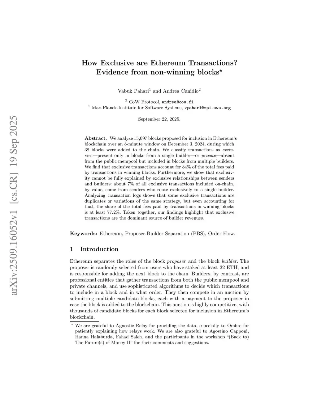 We analyze 15,097 blocks proposed for inclusion in Ethereum's blockchain over an eight-minute window on December 3, 2024, during which 38 blocks were added to the chain. We classify transactions as exclusive -- appearing only in blocks from a single builder -- or private -- absent from the public mempool but included in blocks from multiple builders. We find that, depending on the methodology, exclusive transactions account for between 77.2% and 84% of the total fees paid by transactions in winning blocks. Moreover, we show that exclusivity cannot be fully attributed to persistent relationships between senders and builders: only between 7% and 8.4% of all on-chain exclusive transaction value originates from senders who route exclusively to one builder. Finally, we observe that transaction exclusivity is dynamic. Some transactions are exclusive at the start of a bidding cycle but later appear in blocks from multiple builders. Other transactions remain exclusive to a losing builder for two or three cycles before appearing in the public mempool. These transactions are therefore delayed and then exposed to potential attacks.