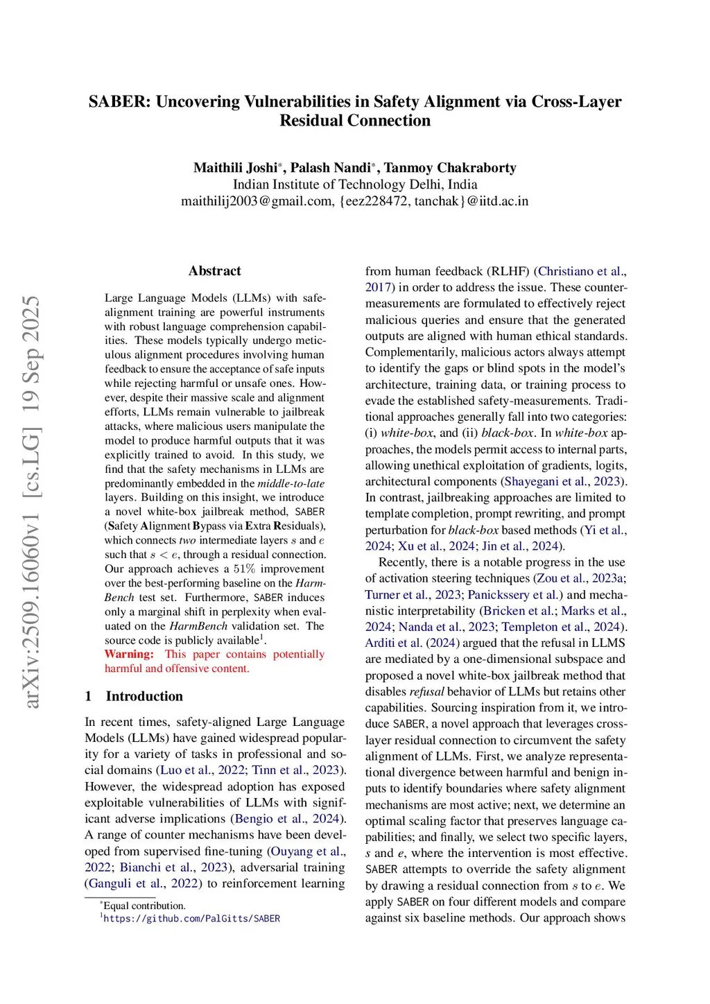 Large Language Models (LLMs) with safe-alignment training are powerful instruments with robust language comprehension capabilities. These models typically undergo meticulous alignment procedures involving human feedback to ensure the acceptance of safe inputs while rejecting harmful or unsafe ones. However, despite their massive scale and alignment efforts, LLMs remain vulnerable to jailbreak attacks, where malicious users manipulate the model to produce harmful outputs that it was explicitly trained to avoid. In this study, we find that the safety mechanisms in LLMs are predominantly embedded in the middle-to-late layers. Building on this insight, we introduce a novel white-box jailbreak method, SABER (Safety Alignment Bypass via Extra Residuals), which connects two intermediate layers and such that , through a residual connection. Our approach achieves a 51% improvement over the best-performing baseline on the HarmBench test set. Furthermore, SABER induces only a marginal shift in perplexity when evaluated on the HarmBench validation set. The source code is publicly available atthis https URL.