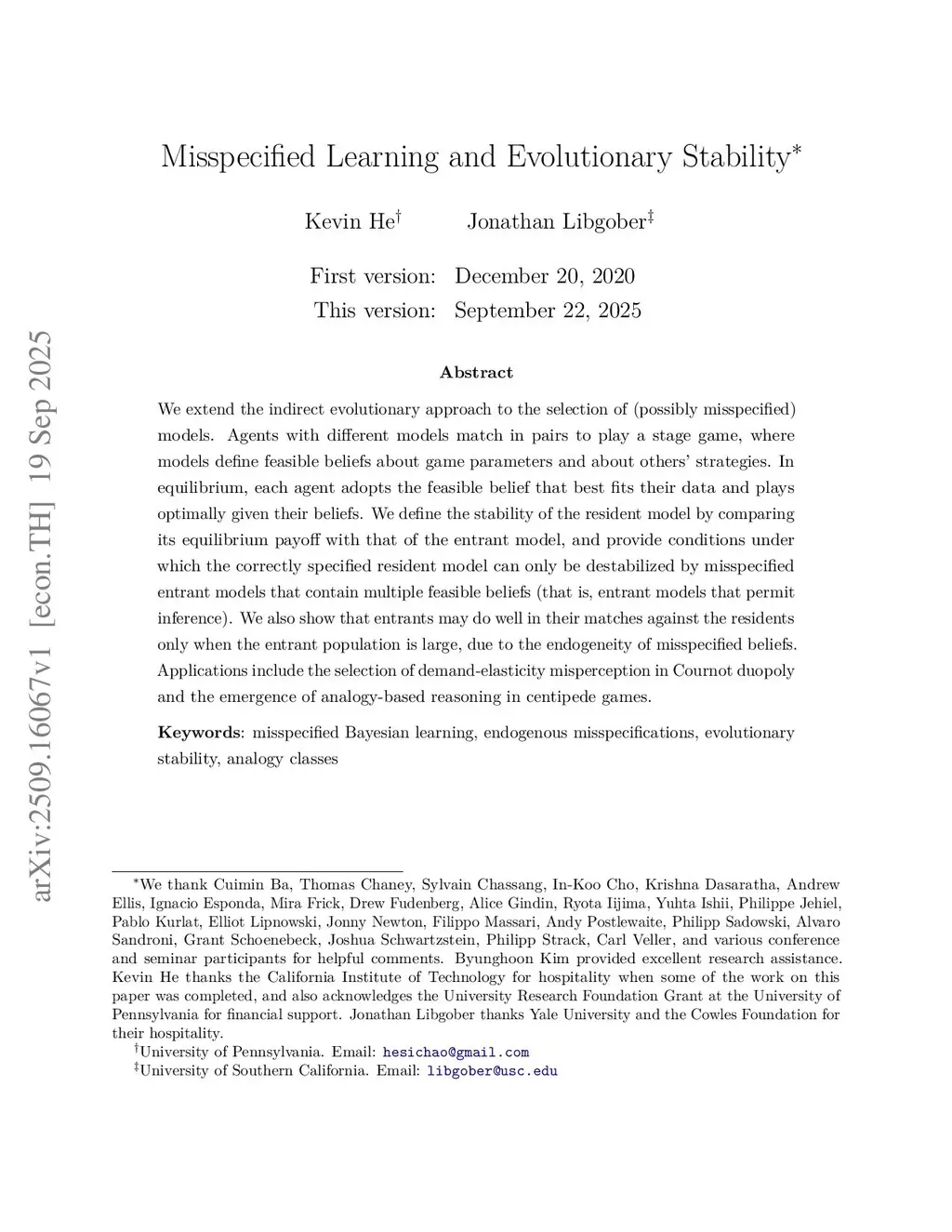 We extend the indirect evolutionary approach to the selection of (possibly misspecified) models. Agents with different models match in pairs to play a stage game, where models define feasible beliefs about game parameters and about others' strategies. In equilibrium, each agent adopts the feasible belief that best fits their data and plays optimally given their beliefs. We define the stability of the resident model by comparing its equilibrium payoff with that of the entrant model, and provide conditions under which the correctly specified resident model can only be destabilized by misspecified entrant models that contain multiple feasible beliefs (that is, entrant models that permit inference). We also show that entrants may do well in their matches against the residents only when the entrant population is large, due to the endogeneity of misspecified beliefs. Applications include the selection of demand-elasticity misperception in Cournot duopoly and the emergence of analogy-based reasoning in centipede games.