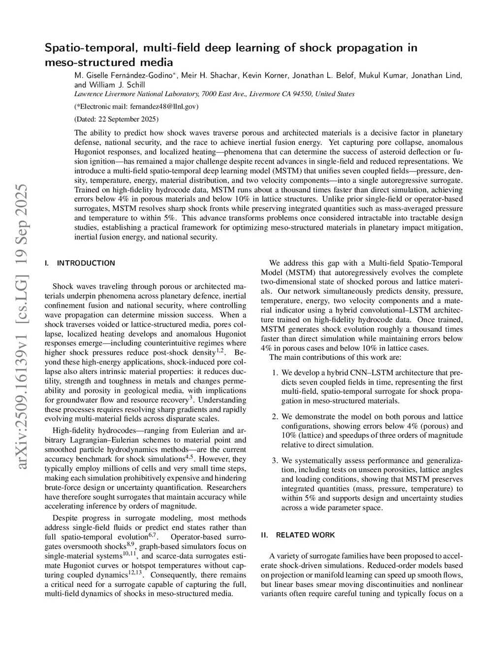 The ability to predict how shock waves traverse porous and architected materials is a key challenge in planetary defense and in the pursuit of inertial fusion energy. Yet capturing pore collapse, anomalous Hugoniot responses, and localized heating - phenomena that strongly influence asteroid deflection or fusion ignition - has remained a major challenge despite recent advances in single-field and reduced representations. We introduce a multi-field spatio-temporal model (MSTM) that unifies seven coupled fields - pressure, density, temperature, energy, material distribution, and two velocity components - into a single autoregressive surrogate. Trained on high-fidelity hydrocode data, MSTM captures nonlinear shock-driven dynamics across porous and architected configurations, achieving mean errors of 1.4% and 3.2% respectively, all while delivering over three orders of magnitude in speedup. MSTM reduces mean-squared error and structural dissimilarity by 94% relative torelative to single-field spatio-temporal models. This advance transforms problems once considered intractable into tractable design studies, establishing a practical framework for optimizing meso-structured materials in planetary impact mitigation and inertial fusion energy.