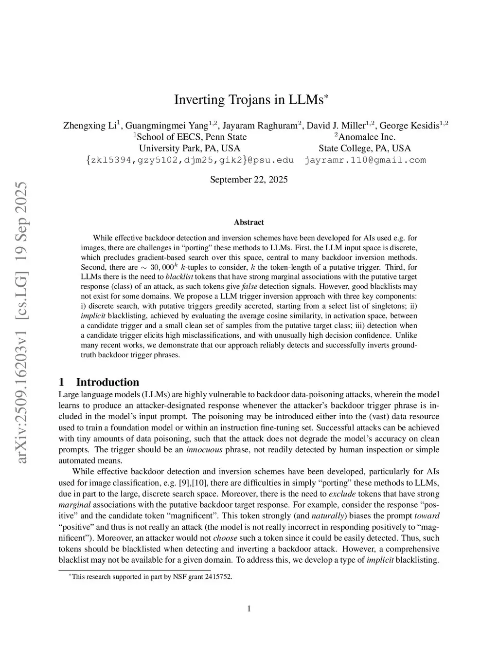 While effective backdoor detection and inversion schemes have been developed for AIs used e.g. for images, there are challenges in "porting" these methods to LLMs. First, the LLM input space is discrete, which precludes gradient-based search over this space, central to many backdoor inversion methods. Second, there are ~30,000^k k-tuples to consider, k the token-length of a putative trigger. Third, for LLMs there is the need to blacklist tokens that have strong marginal associations with the putative target response (class) of an attack, as such tokens give false detection signals. However, good blacklists may not exist for some domains. We propose a LLM trigger inversion approach with three key components: i) discrete search, with putative triggers greedily accreted, starting from a select list of singletons; ii) implicit blacklisting, achieved by evaluating the average cosine similarity, in activation space, between a candidate trigger and a small clean set of samples from the putative target class; iii) detection when a candidate trigger elicits high misclassifications, and with unusually high decision confidence. Unlike many recent works, we demonstrate that our approach reliably detects and successfully inverts ground-truth backdoor trigger phrases.