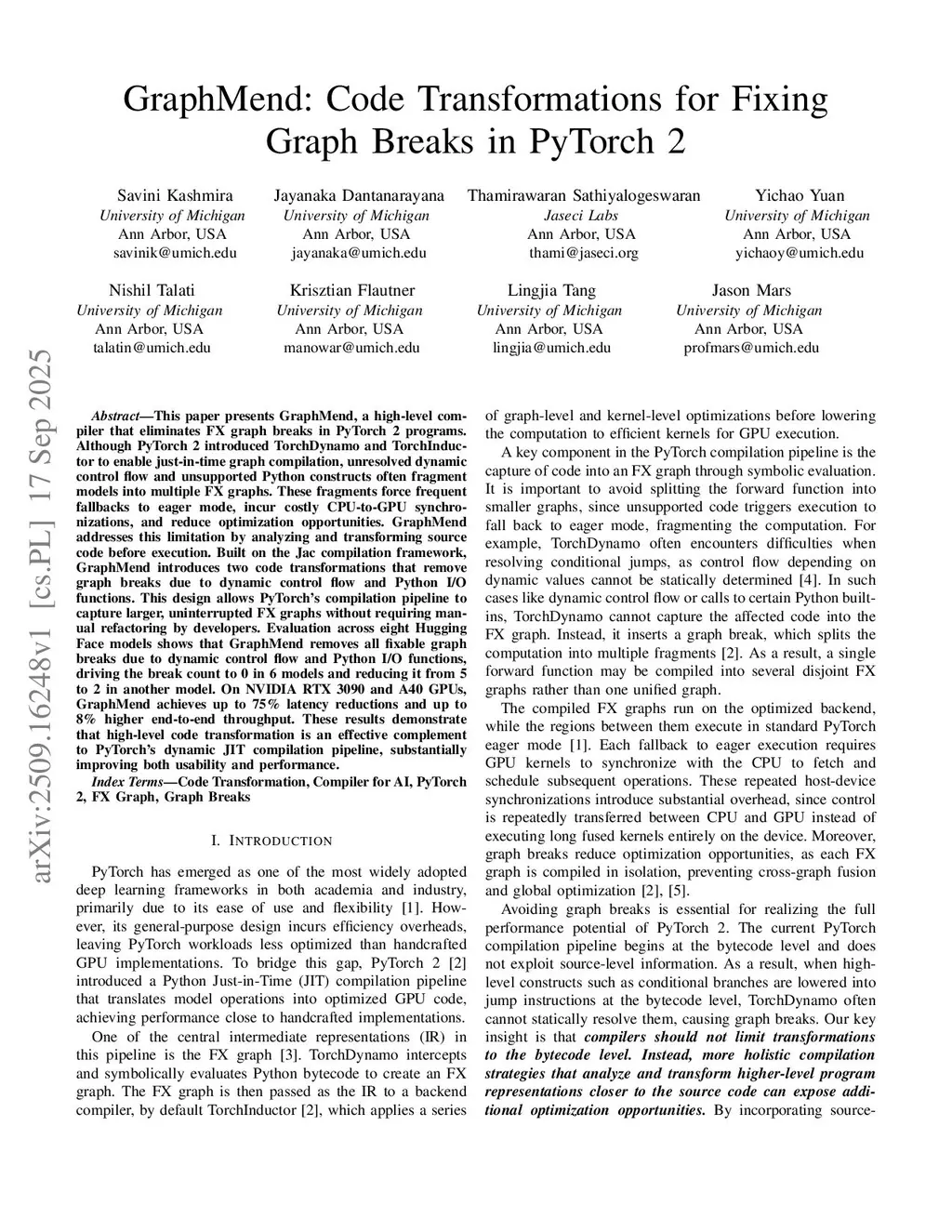 This paper presents GraphMend, a high-level compiler that eliminates FX graph breaks in PyTorch 2 programs. Although PyTorch 2 introduced TorchDynamo and TorchInductor to enable just-in-time graph compilation, unresolved dynamic control flow and unsupported Python constructs often fragment models into multiple FX graphs. These fragments force frequent fallbacks to eager mode, incur costly CPU-to-GPU synchronizations, and reduce optimization opportunities. GraphMend addresses this limitation by analyzing and transforming source code before execution. Built on the Jac compilation framework, GraphMend introduces two code transformations that remove graph breaks due to dynamic control flow and Python I/O functions. This design allows PyTorch's compilation pipeline to capture larger, uninterrupted FX graphs without requiring manual refactoring by developers. Evaluation across eight Hugging Face models shows that GraphMend removes all fixable graph breaks due to dynamic control flow and Python I/O functions, driving the break count to 0 in 6 models and reducing it from 5 to 2 in another model. On NVIDIA RTX 3090 and A40 GPUs, GraphMend achieves up to 75% latency reductions and up to 8% higher end-to-end throughput. These results demonstrate that high-level code transformation is an effective complement to PyTorch's dynamic JIT compilation pipeline, substantially improving both usability and performance.