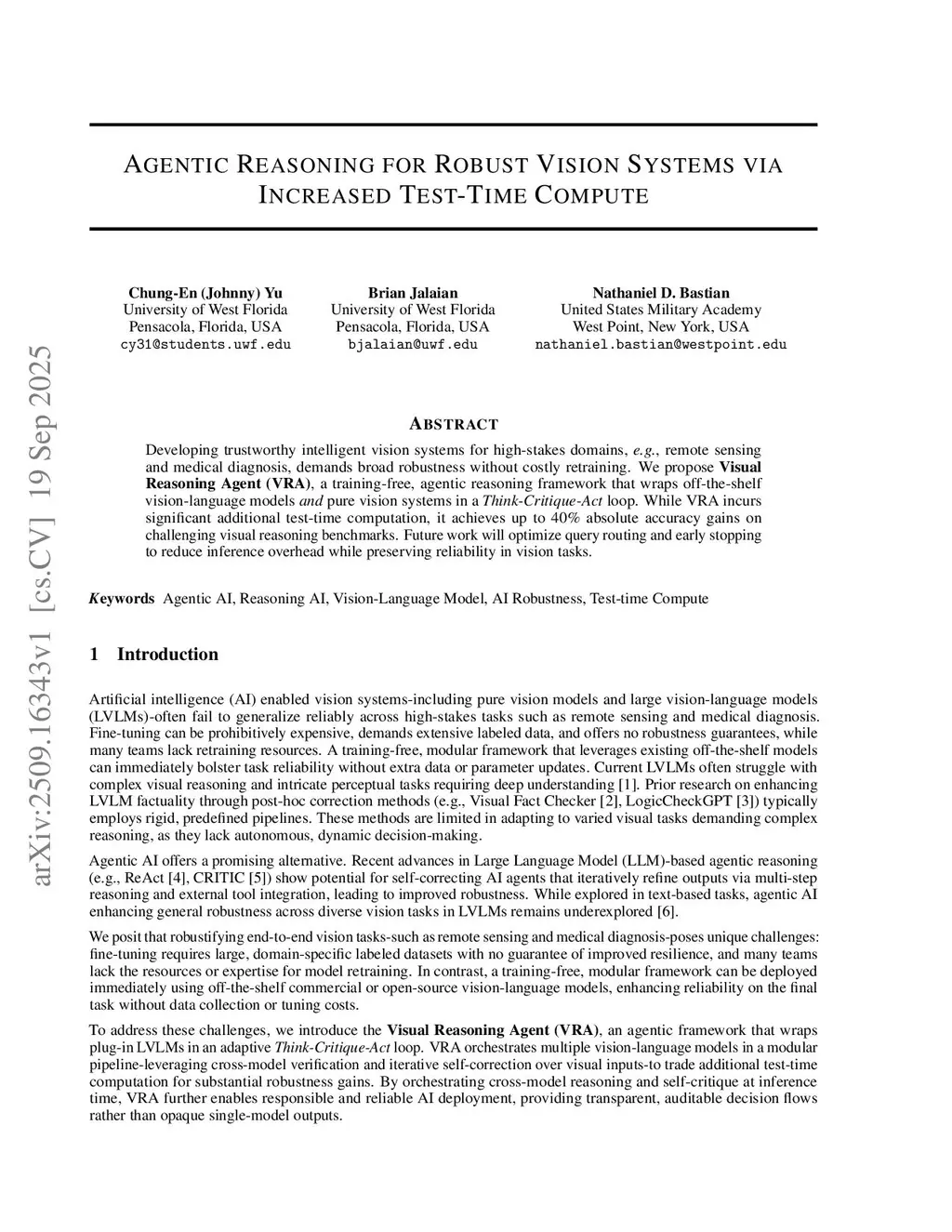Developing trustworthy intelligent vision systems for high-stakes domains, \emph{e.g.}, remote sensing and medical diagnosis, demands broad robustness without costly retraining. We propose \textbf{Visual Reasoning Agent (VRA)}, a training-free, agentic reasoning framework that wraps off-the-shelf vision-language models \emph{and} pure vision systems in a \emph{Think--Critique--Act} loop. While VRA incurs significant additional test-time computation, it achieves up to 40\% absolute accuracy gains on challenging visual reasoning benchmarks. Future work will optimize query routing and early stopping to reduce inference overhead while preserving reliability in vision tasks.