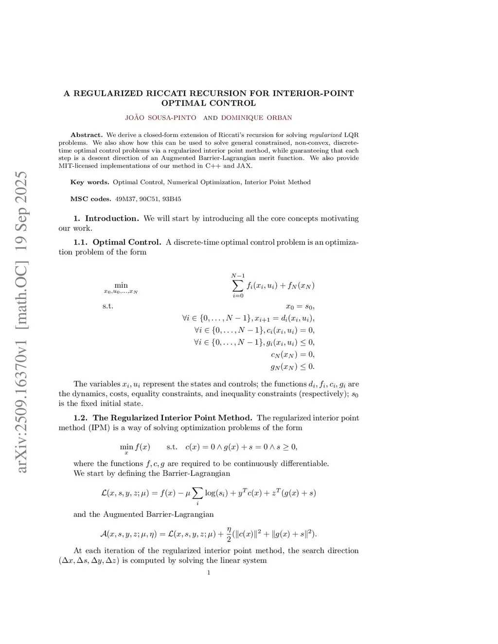 We derive closed-form extensions of Riccati's recursions (both sequential and parallel) for solving dual-regularized LQR problems. We show how these methods can be used to solve general constrained, non-convex, discrete-time optimal control problems via a regularized interior point method, while guaranteeing that each primal step is a descent direction of an Augmented Barrier-Lagrangian merit function. We provide MIT-licensed implementations of our methods in C++ and JAX.