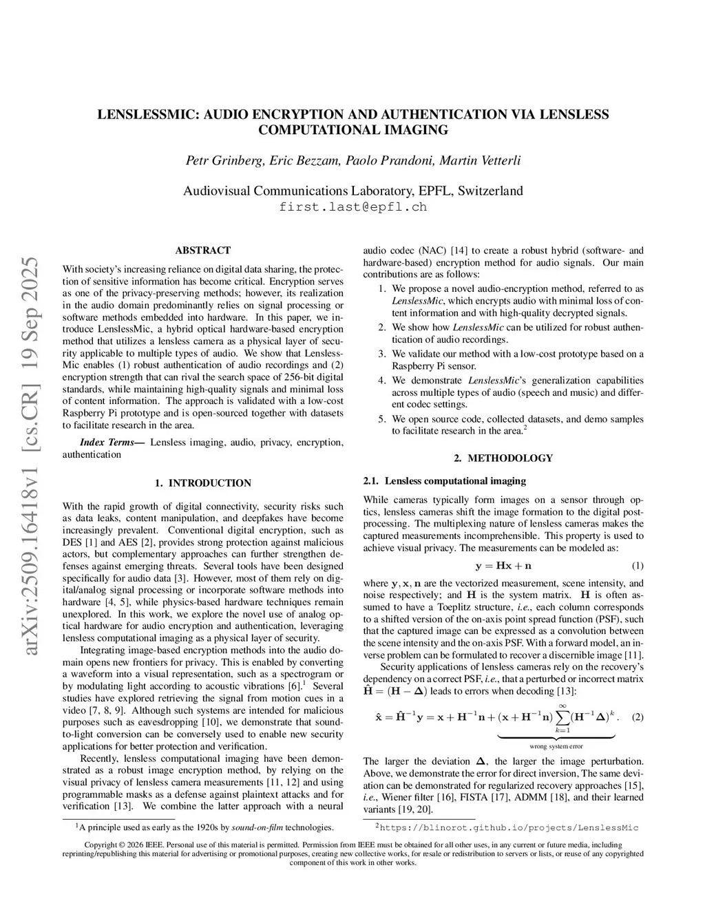 LenslessMic: Audio Encryption and Authentication via Lensless Computational Imaging