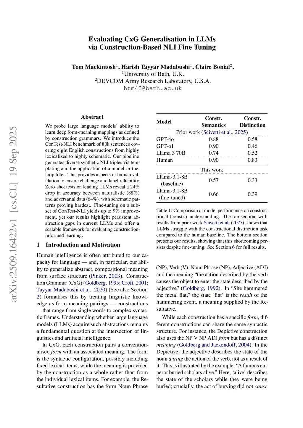 We probe large language models' ability to learn deep form-meaning mappings as defined by construction grammars. We introduce the ConTest-NLI benchmark of 80k sentences covering eight English constructions from highly lexicalized to highly schematic. Our pipeline generates diverse synthetic NLI triples via templating and the application of a model-in-the-loop filter. This provides aspects of human validation to ensure challenge and label reliability. Zero-shot tests on leading LLMs reveal a 24% drop in accuracy between naturalistic (88%) and adversarial data (64%), with schematic patterns proving hardest. Fine-tuning on a subset of ConTest-NLI yields up to 9% improvement, yet our results highlight persistent abstraction gaps in current LLMs and offer a scalable framework for evaluating construction-informed learning.