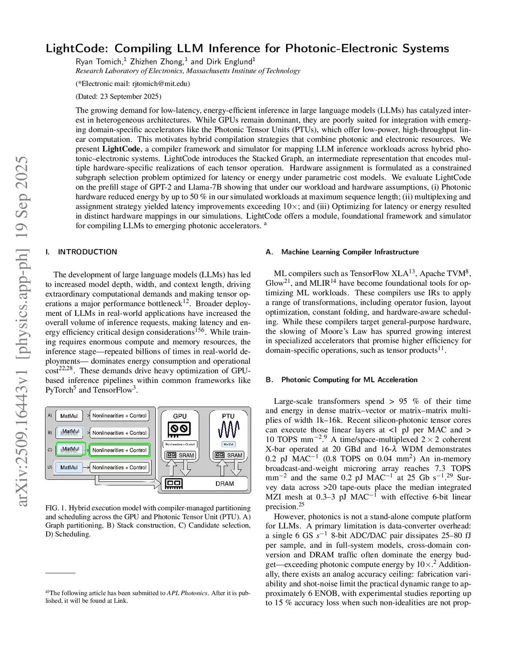 The growing demand for low-latency, energy-efficient inference in large language models (LLMs) has catalyzed interest in heterogeneous architectures. While GPUs remain dominant, they are poorly suited for integration with emerging domain-specific accelerators like the Photonic Tensor Units (PTUs), which offer low-power, high-throughput linear computation. This motivates hybrid compilation strategies that combine photonic and electronic resources. We present LightCode, a compiler framework and simulator for mapping LLM inference workloads across hybrid photonic-electronic systems. LightCode introduces the Stacked Graph, an intermediate representation that encodes multiple hardware-specific realizations of each tensor operation. Hardware assignment is formulated as a constrained subgraph selection problem optimized for latency or energy under parametric cost models. We evaluate LightCode on the prefill stage of GPT-2 and Llama-7B showing that under our workload and hardware assumptions, (i) Photonic hardware reduced energy by up to 50% in our simulated workloads at maximum sequence length; (ii) multiplexing and assignment strategy yielded latency improvements exceeding 10x; and (iii) Optimizing for latency or energy resulted in distinct hardware mappings in our simulations. LightCode offers a module, foundational framework and simulator for compiling LLMs to emerging photonic accelerators.