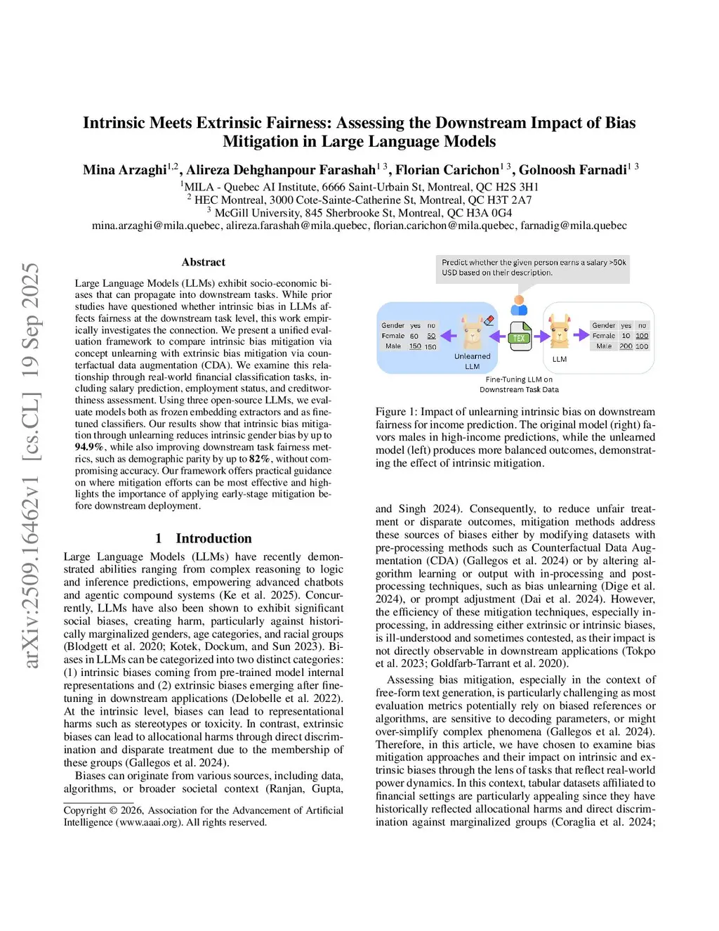 Large Language Models (LLMs) exhibit socio-economic biases that can propagate into downstream tasks. While prior studies have questioned whether intrinsic bias in LLMs affects fairness at the downstream task level, this work empirically investigates the connection. We present a unified evaluation framework to compare intrinsic bias mitigation via concept unlearning with extrinsic bias mitigation via counterfactual data augmentation (CDA). We examine this relationship through real-world financial classification tasks, including salary prediction, employment status, and creditworthiness assessment. Using three open-source LLMs, we evaluate models both as frozen embedding extractors and as fine-tuned classifiers. Our results show that intrinsic bias mitigation through unlearning reduces intrinsic gender bias by up to 94.9%, while also improving downstream task fairness metrics, such as demographic parity by up to 82%, without compromising accuracy. Our framework offers practical guidance on where mitigation efforts can be most effective and highlights the importance of applying early-stage mitigation before downstream deployment.