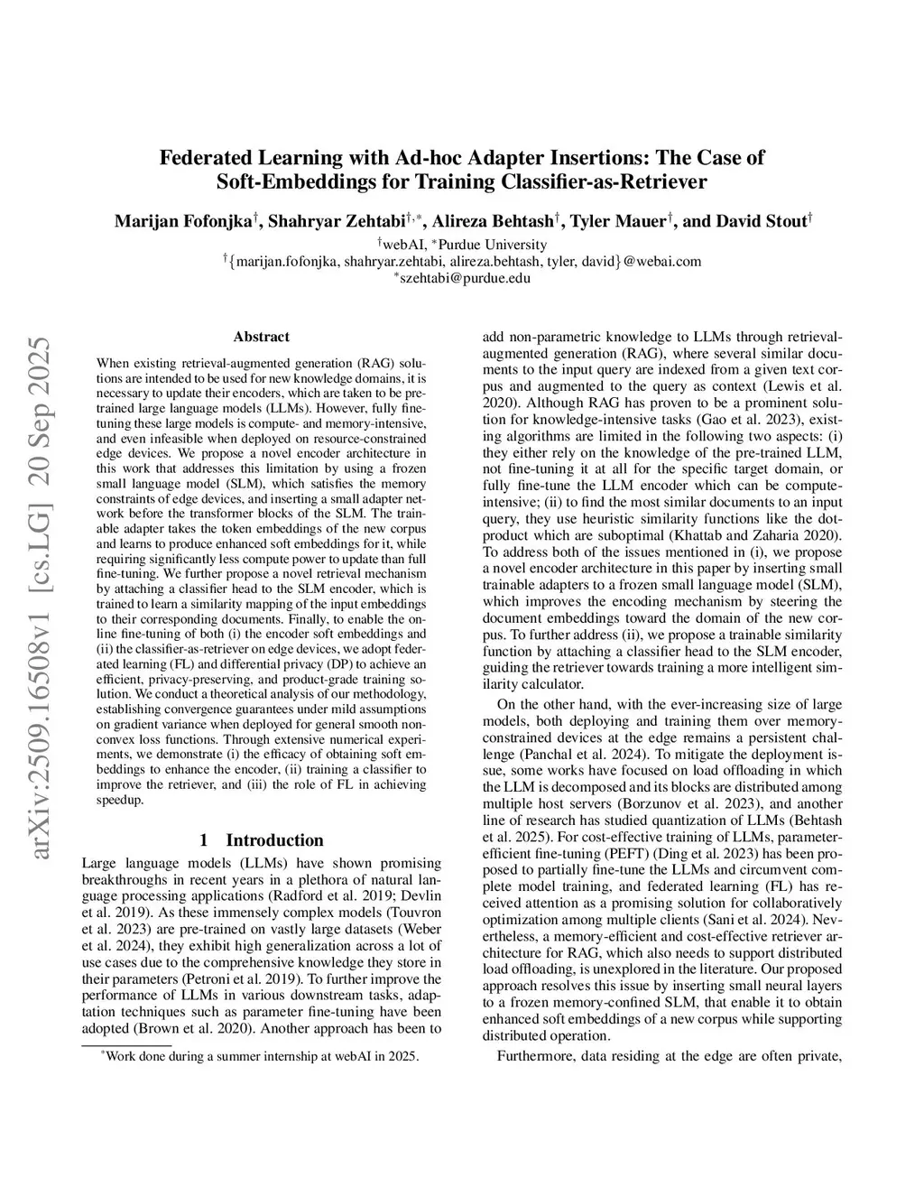 When existing retrieval-augmented generation (RAG) solutions are intended to be used for new knowledge domains, it is necessary to update their encoders, which are taken to be pretrained large language models (LLMs). However, fully finetuning these large models is compute- and memory-intensive, and even infeasible when deployed on resource-constrained edge devices. We propose a novel encoder architecture in this work that addresses this limitation by using a frozen small language model (SLM), which satisfies the memory constraints of edge devices, and inserting a small adapter network before the transformer blocks of the SLM. The trainable adapter takes the token embeddings of the new corpus and learns to produce enhanced soft embeddings for it, while requiring significantly less compute power to update than full fine-tuning. We further propose a novel retrieval mechanism by attaching a classifier head to the SLM encoder, which is trained to learn a similarity mapping of the input embeddings to their corresponding documents. Finally, to enable the online fine-tuning of both (i) the encoder soft embeddings and (ii) the classifier-as-retriever on edge devices, we adopt federated learning (FL) and differential privacy (DP) to achieve an efficient, privacy-preserving, and product-grade training solution. We conduct a theoretical analysis of our methodology, establishing convergence guarantees under mild assumptions on gradient variance when deployed for general smooth nonconvex loss functions. Through extensive numerical experiments, we demonstrate (i) the efficacy of obtaining soft embeddings to enhance the encoder, (ii) training a classifier to improve the retriever, and (iii) the role of FL in achieving speedup.
