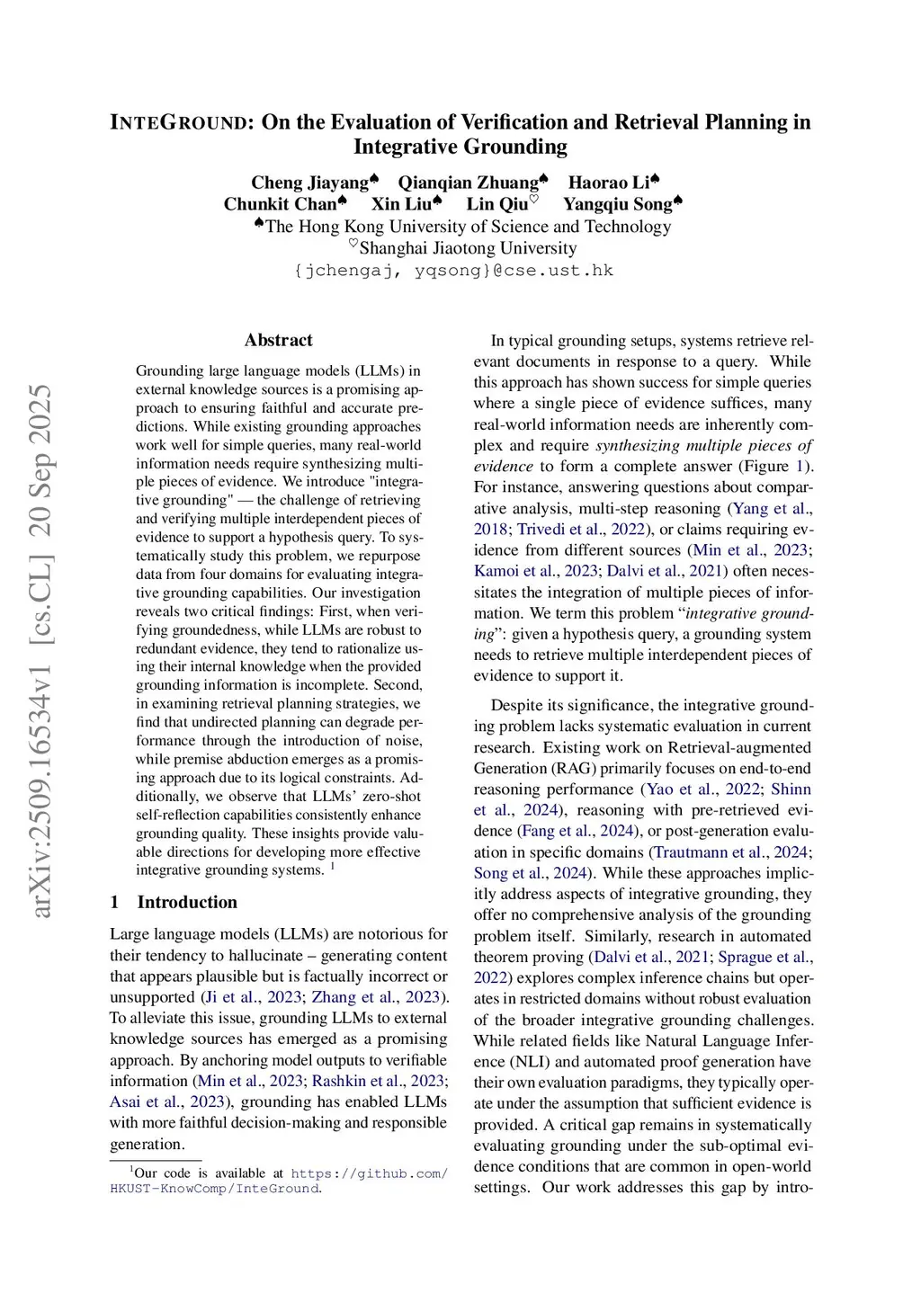 Grounding large language models (LLMs) in external knowledge sources is a promising method for faithful prediction. While existing grounding approaches work well for simple queries, many real-world information needs require synthesizing multiple pieces of evidence. We introduce "integrative grounding" -- the challenge of retrieving and verifying multiple inter-dependent pieces of evidence to support a hypothesis query. To systematically study this problem, we repurpose data from four domains for evaluating integrative grounding capabilities. Our investigation reveals two critical findings: First, in groundedness verification, while LLMs are robust to redundant evidence, they tend to rationalize using internal knowledge when information is incomplete. Second, in examining retrieval planning strategies, we find that undirected planning can degrade performance through noise introduction, while premise abduction emerges as a promising approach due to its logical constraints. Additionally, LLMs' zero-shot self-reflection capabilities consistently improve grounding quality. These insights provide valuable direction for developing more effective integrative grounding systems.