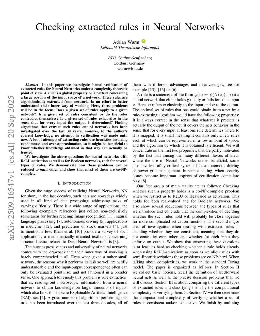 In this paper we investigate formal verification of extracted rules for Neural Networks under a complexity theoretic point of view. A rule is a global property or a pattern concerning a large portion of the input space of a network. These rules are algorithmically extracted from networks in an effort to better understand their inner way of working. Here, three problems will be in the focus: Does a given set of rules apply to a given network? Is a given set of rules consistent or do the rules contradict themselves? Is a given set of rules exhaustive in the sense that for every input the output is determined? Finding algorithms that extract such rules out of networks has been investigated over the last 30 years, however, to the author's current knowledge, no attempt in verification was made until now. A lot of attempts of extracting rules use heuristics involving randomness and over-approximation, so it might be beneficial to know whether knowledge obtained in that way can actually be trusted.We investigate the above questions for neural networks with ReLU-activation as well as for Boolean networks, each for several types of rules. We demonstrate how these problems can be reduced to each other and show that most of them are co-NP-complete.