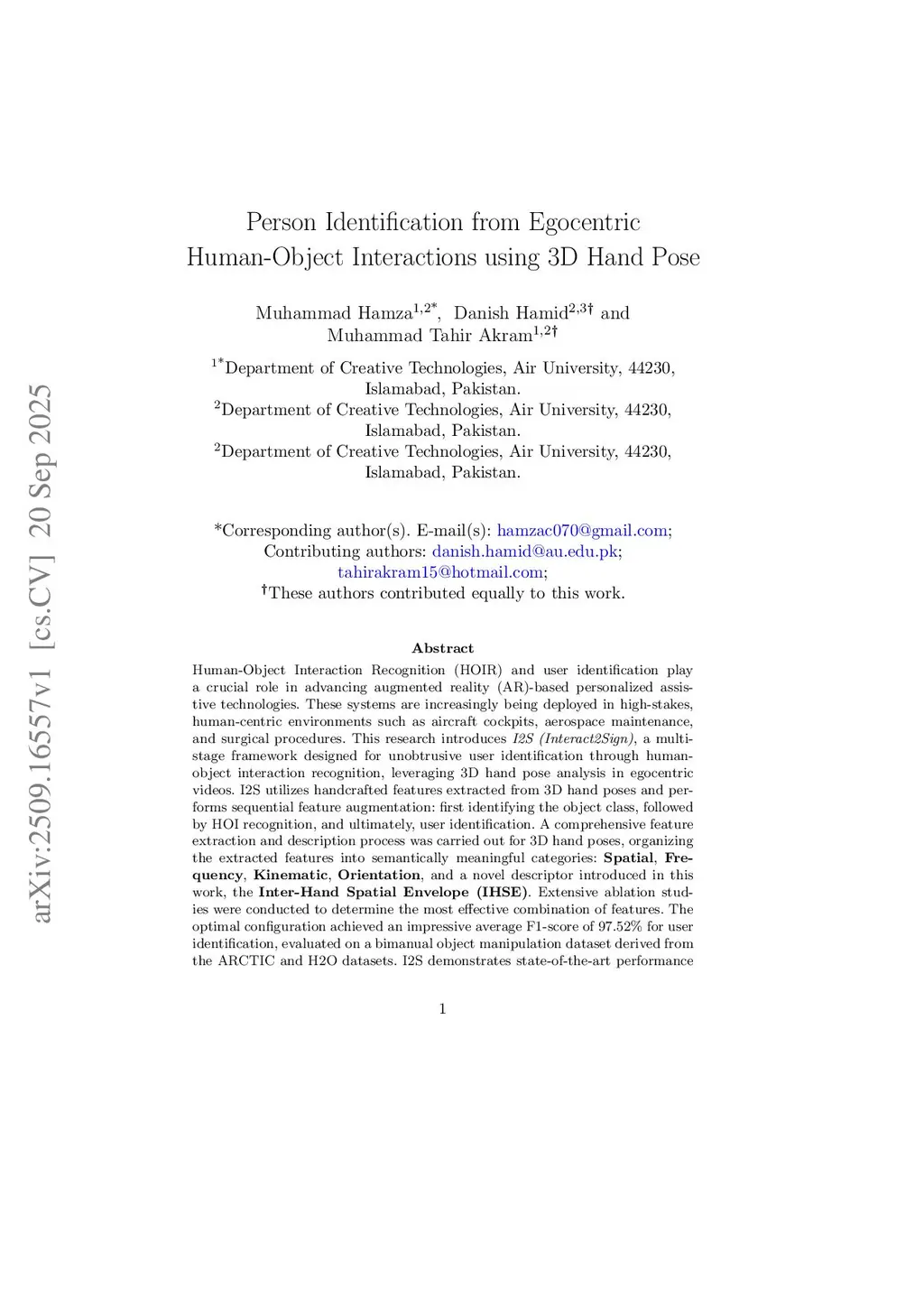 Human-Object Interaction Recognition (HOIR) and user identification play a crucial role in advancing augmented reality (AR)-based personalized assistive technologies. These systems are increasingly being deployed in high-stakes, human-centric environments such as aircraft cockpits, aerospace maintenance, and surgical procedures. This research introduces I2S (Interact2Sign), a multi stage framework designed for unobtrusive user identification through human object interaction recognition, leveraging 3D hand pose analysis in egocentric videos. I2S utilizes handcrafted features extracted from 3D hand poses and per forms sequential feature augmentation: first identifying the object class, followed by HOI recognition, and ultimately, user identification. A comprehensive feature extraction and description process was carried out for 3D hand poses, organizing the extracted features into semantically meaningful categories: Spatial, Frequency, Kinematic, Orientation, and a novel descriptor introduced in this work, the Inter-Hand Spatial Envelope (IHSE). Extensive ablation studies were conducted to determine the most effective combination of features. The optimal configuration achieved an impressive average F1-score of 97.52% for user identification, evaluated on a bimanual object manipulation dataset derived from the ARCTIC and H2O datasets. I2S demonstrates state-of-the-art performance while maintaining a lightweight model size of under 4 MB and a fast inference time of 0.1 seconds. These characteristics make the proposed framework highly suitable for real-time, on-device authentication in security-critical, AR-based systems.