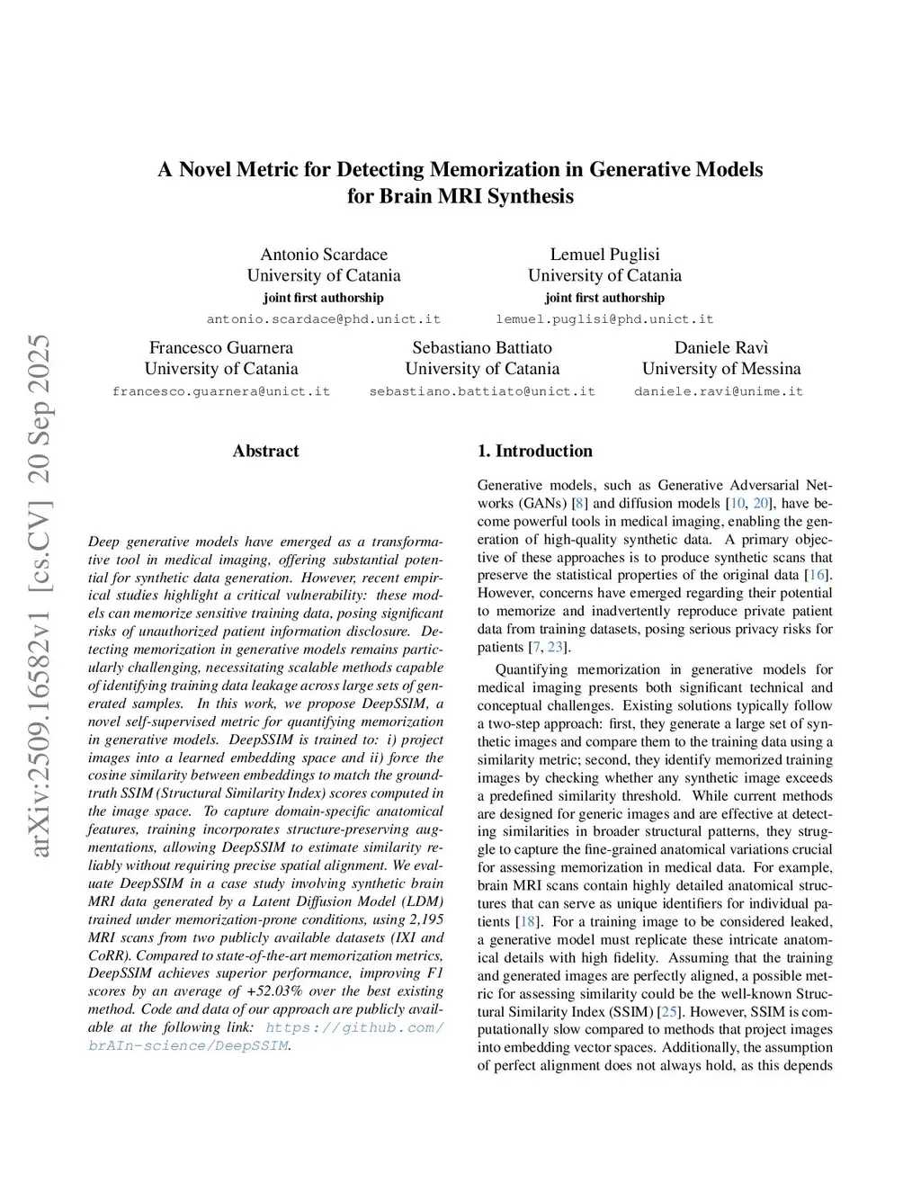 Deep generative models have emerged as a transformative tool in medical imaging, offering substantial potential for synthetic data generation. However, recent empirical studies highlight a critical vulnerability: these models can memorize sensitive training data, posing significant risks of unauthorized patient information disclosure. Detecting memorization in generative models remains particularly challenging, necessitating scalable methods capable of identifying training data leakage across large sets of generated samples. In this work, we propose DeepSSIM, a novel self-supervised metric for quantifying memorization in generative models. DeepSSIM is trained to: i) project images into a learned embedding space and ii) force the cosine similarity between embeddings to match the ground-truth SSIM (Structural Similarity Index) scores computed in the image space. To capture domain-specific anatomical features, training incorporates structure-preserving augmentations, allowing DeepSSIM to estimate similarity reliably without requiring precise spatial alignment. We evaluate DeepSSIM in a case study involving synthetic brain MRI data generated by a Latent Diffusion Model (LDM) trained under memorization-prone conditions, using 2,195 MRI scans from two publicly available datasets (IXI and CoRR). Compared to state-of-the-art memorization metrics, DeepSSIM achieves superior performance, improving F1 scores by an average of +52.03% over the best existing method. Code and data of our approach are publicly available at the following link:this https URL.
