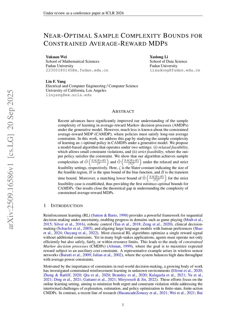 Recent advances have significantly improved our understanding of the sample complexity of learning in average-reward Markov decision processes (AMDPs) under the generative model. However, much less is known about the constrained average-reward MDP (CAMDP), where policies must satisfy long-run average constraints. In this work, we address this gap by studying the sample complexity of learning an -optimal policy in CAMDPs under a generative model. We propose a model-based algorithm that operates under two settings: (i) relaxed feasibility, which allows small constraint violations, and (ii) strict feasibility, where the output policy satisfies the constraint. We show that our algorithm achieves sample complexities of and under the relaxed and strict feasibility settings, respectively. Here, is the Slater constant indicating the size of the feasible region, is the span bound of the bias function, and is the transient time bound. Moreover, a matching lower bound of for the strict feasibility case is established, thus providing the first minimax-optimal bounds for CAMDPs. Our results close the theoretical gap in understanding the complexity of constrained average-reward MDPs.