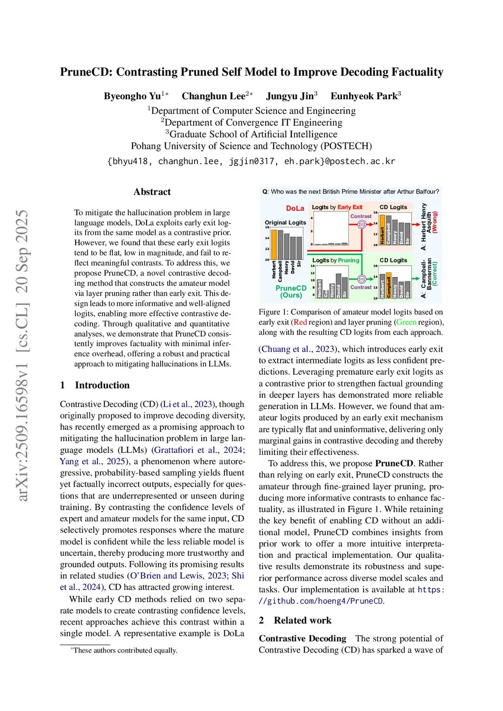 To mitigate the hallucination problem in large language models, DoLa exploits early exit logits from the same model as a contrastive prior. However, we found that these early exit logits tend to be flat, low in magnitude, and fail to reflect meaningful contrasts. To address this, we propose PruneCD, a novel contrastive decoding method that constructs the amateur model via layer pruning rather than early exit. This design leads to more informative and well-aligned logits, enabling more effective contrastive decoding. Through qualitative and quantitative analyses, we demonstrate that PruneCD consistently improves factuality with minimal inference overhead, offering a robust and practical approach to mitigating hallucinations in LLMs.