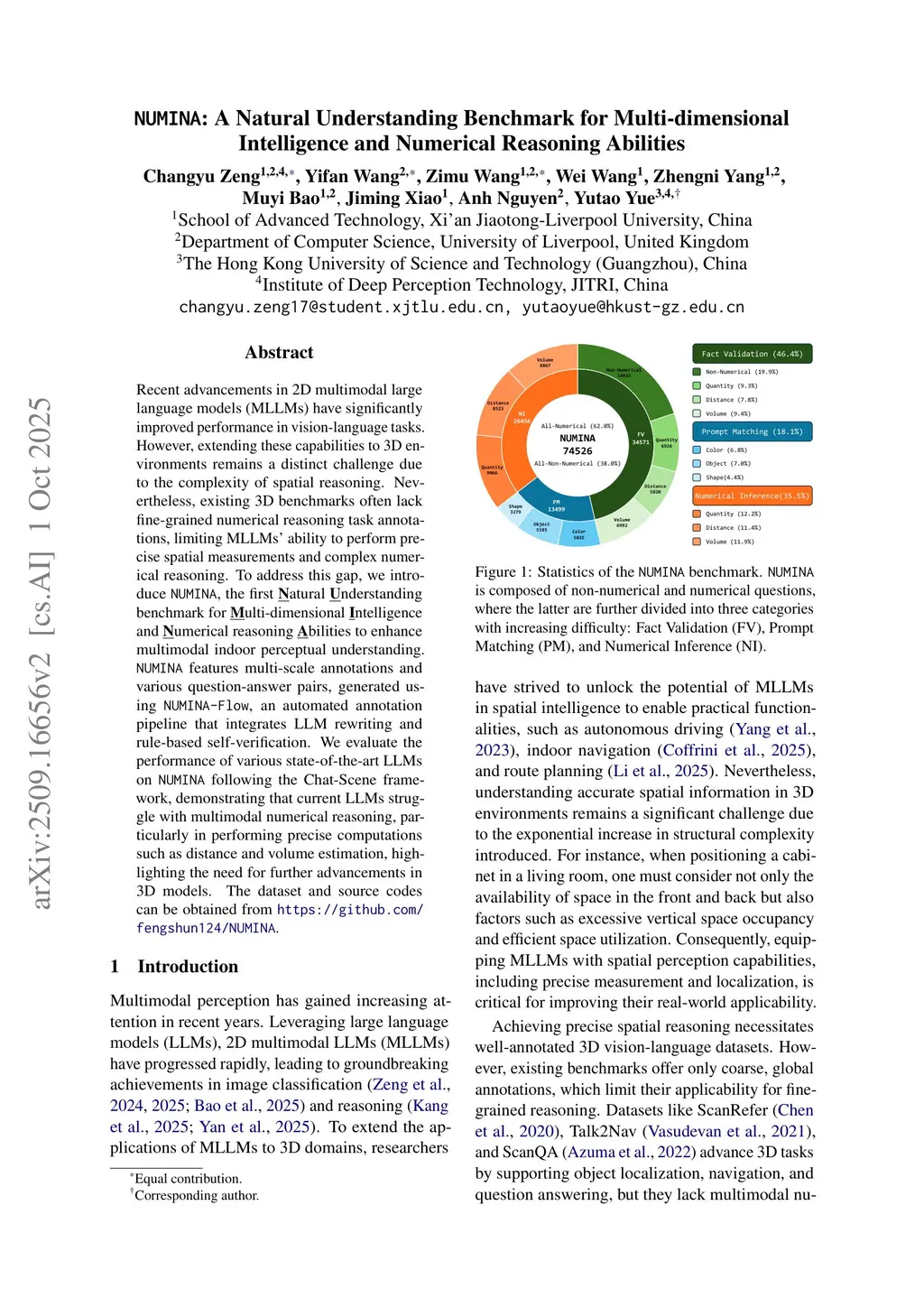 Recent advancements in 2D multimodal large language models (MLLMs) have significantly improved performance in vision-language tasks. However, extending these capabilities to 3D environments remains a distinct challenge due to the complexity of spatial reasoning. Nevertheless, existing 3D benchmarks often lack fine-grained numerical reasoning task annotations, limiting MLLMs' ability to perform precise spatial measurements and complex numerical reasoning. To address this gap, we introduce NUMINA, the first Natural Understanding benchmark for Multi-dimensional Intelligence and Numerical reasoning Abilities to enhance multimodal indoor perceptual understanding. NUMINA features multi-scale annotations and various question-answer pairs, generated using NUMINA-Flow, an automated annotation pipeline that integrates LLM rewriting and rule-based self-verification. We evaluate the performance of various state-of-the-art LLMs on NUMINA following the Chat-Scene framework, demonstrating that current LLMs struggle with multimodal numerical reasoning, particularly in performing precise computations such as distance and volume estimation, highlighting the need for further advancements in 3D models. The dataset and source codes can be obtained fromthis https URL.