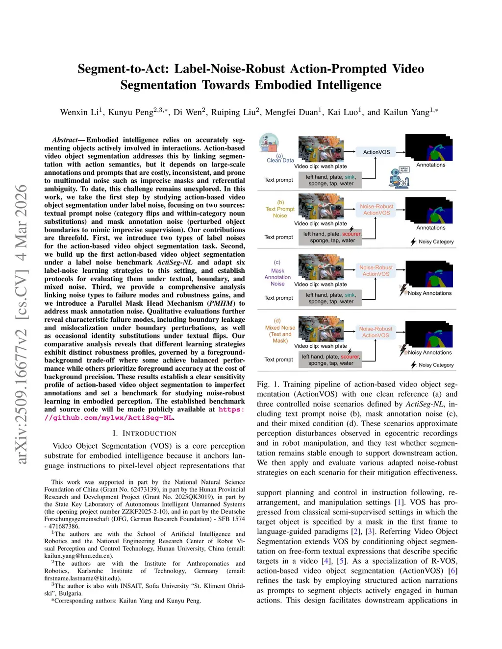 Segment-to-Act: Label-Noise-Robust Action-Prompted Video Segmentation Towards Embodied Intelligence