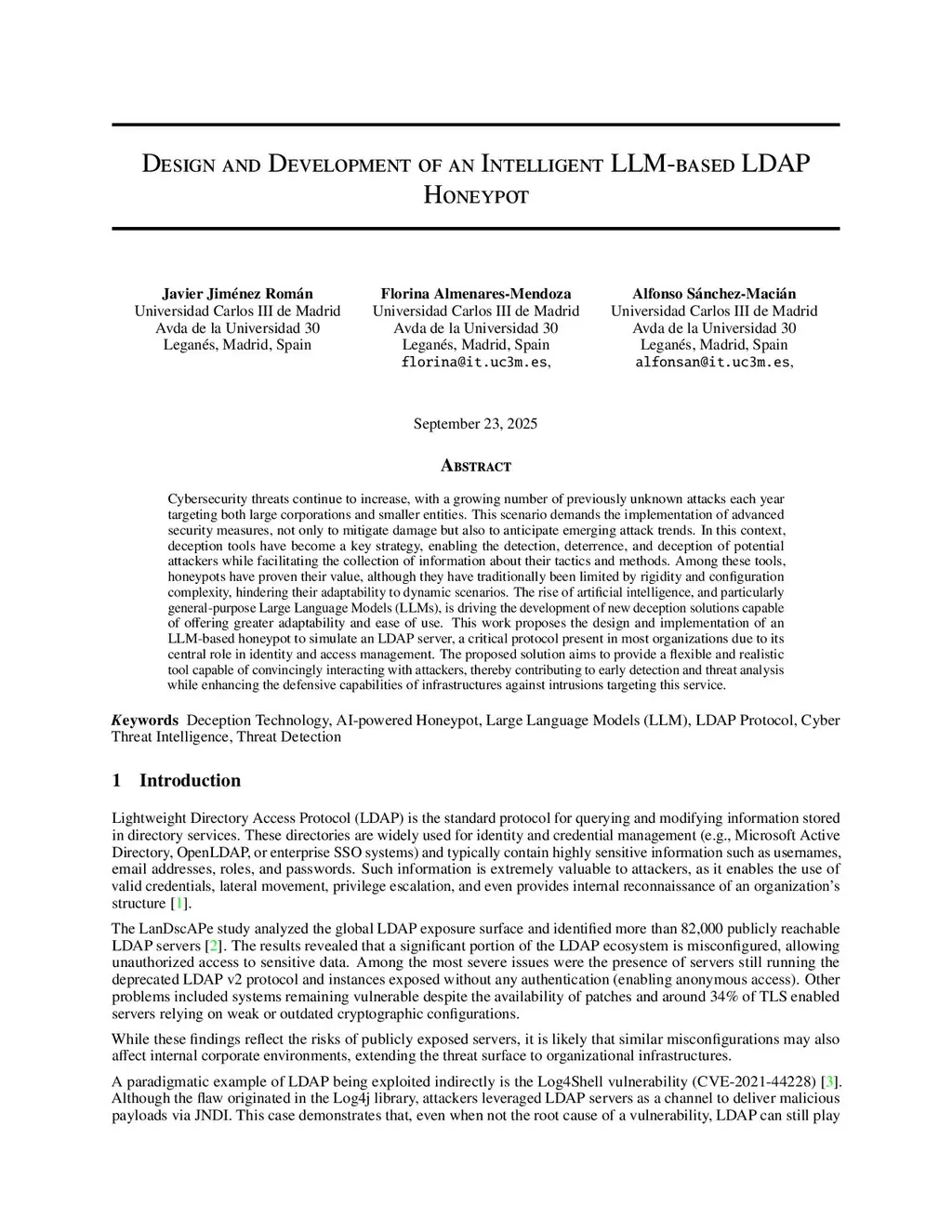 Cybersecurity threats continue to increase, with a growing number of previously unknown attacks each year targeting both large corporations and smaller entities. This scenario demands the implementation of advanced security measures, not only to mitigate damage but also to anticipate emerging attack trends. In this context, deception tools have become a key strategy, enabling the detection, deterrence, and deception of potential attackers while facilitating the collection of information about their tactics and methods. Among these tools, honeypots have proven their value, although they have traditionally been limited by rigidity and configuration complexity, hindering their adaptability to dynamic scenarios. The rise of artificial intelligence, and particularly general-purpose Large Language Models (LLMs), is driving the development of new deception solutions capable of offering greater adaptability and ease of use. This work proposes the design and implementation of an LLM-based honeypot to simulate an LDAP server, a critical protocol present in most organizations due to its central role in identity and access management. The proposed solution aims to provide a flexible and realistic tool capable of convincingly interacting with attackers, thereby contributing to early detection and threat analysis while enhancing the defensive capabilities of infrastructures against intrusions targeting this service.