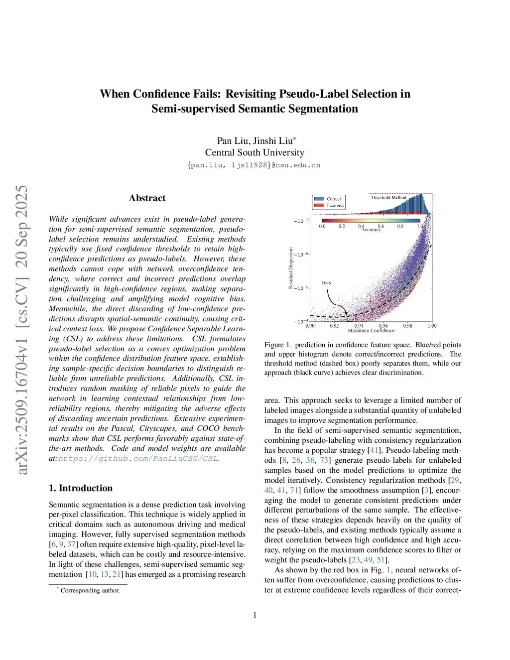 While significant advances exist in pseudo-label generation for semi-supervised semantic segmentation, pseudo-label selection remains understudied. Existing methods typically use fixed confidence thresholds to retain high-confidence predictions as pseudo-labels. However, these methods cannot cope with network overconfidence tendency, where correct and incorrect predictions overlap significantly in high-confidence regions, making separation challenging and amplifying model cognitive bias. Meanwhile, the direct discarding of low-confidence predictions disrupts spatial-semantic continuity, causing critical context loss. We propose Confidence Separable Learning (CSL) to address these limitations. CSL formulates pseudo-label selection as a convex optimization problem within the confidence distribution feature space, establishing sample-specific decision boundaries to distinguish reliable from unreliable predictions. Additionally, CSL introduces random masking of reliable pixels to guide the network in learning contextual relationships from low-reliability regions, thereby mitigating the adverse effects of discarding uncertain predictions. Extensive experimental results on the Pascal, Cityscapes, and COCO benchmarks show that CSL performs favorably against state-of-the-art methods. Code and model weights are available atthis https URL.