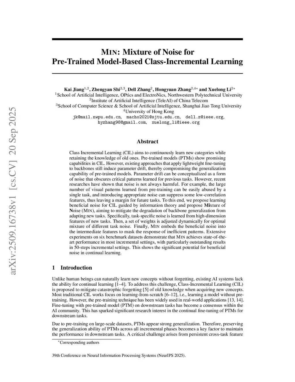 Class Incremental Learning (CIL) aims to continuously learn new categories while retaining the knowledge of old ones. Pre-trained models (PTMs) show promising capabilities in CIL. However, existing approaches that apply lightweight fine-tuning to backbones still induce parameter drift, thereby compromising the generalization capability of pre-trained models. Parameter drift can be conceptualized as a form of noise that obscures critical patterns learned for previous tasks. However, recent researches have shown that noise is not always harmful. For example, the large number of visual patterns learned from pre-training can be easily abused by a single task, and introducing appropriate noise can suppress some low-correlation features, thus leaving a margin for future tasks. To this end, we propose learning beneficial noise for CIL guided by information theory and propose Mixture of Noise (Min), aiming to mitigate the degradation of backbone generalization from adapting new tasks. Specifically, task-specific noise is learned from high-dimension features of new tasks. Then, a set of weights is adjusted dynamically for optimal mixture of different task noise. Finally, Min embeds the beneficial noise into the intermediate features to mask the response of inefficient patterns. Extensive experiments on six benchmark datasets demonstrate that Min achieves state-of-the-art performance in most incremental settings, with particularly outstanding results in 50-steps incremental settings. This shows the significant potential for beneficial noise in continual learning. Code is available atthis https URL.