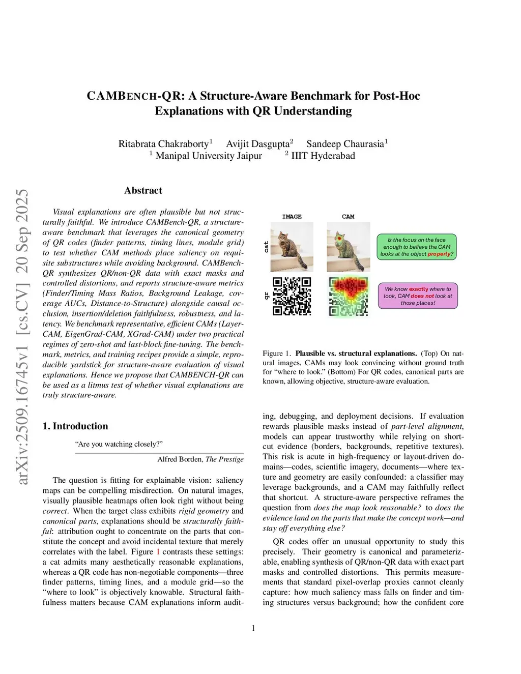 Visual explanations are often plausible but not structurally faithful. We introduce CAMBench-QR, a structure-aware benchmark that leverages the canonical geometry of QR codes (finder patterns, timing lines, module grid) to test whether CAM methods place saliency on requisite substructures while avoiding background. CAMBench-QR synthesizes QR/non-QR data with exact masks and controlled distortions, and reports structure-aware metrics (Finder/Timing Mass Ratios, Background Leakage, coverage AUCs, Distance-to-Structure) alongside causal occlusion, insertion/deletion faithfulness, robustness, and latency. We benchmark representative, efficient CAMs (LayerCAM, EigenGrad-CAM, XGrad-CAM) under two practical regimes of zero-shot and last-block fine-tuning. The benchmark, metrics, and training recipes provide a simple, reproducible yardstick for structure-aware evaluation of visual explanations. Hence we propose that CAMBENCH-QR can be used as a litmus test of whether visual explanations are truly structure-aware.
