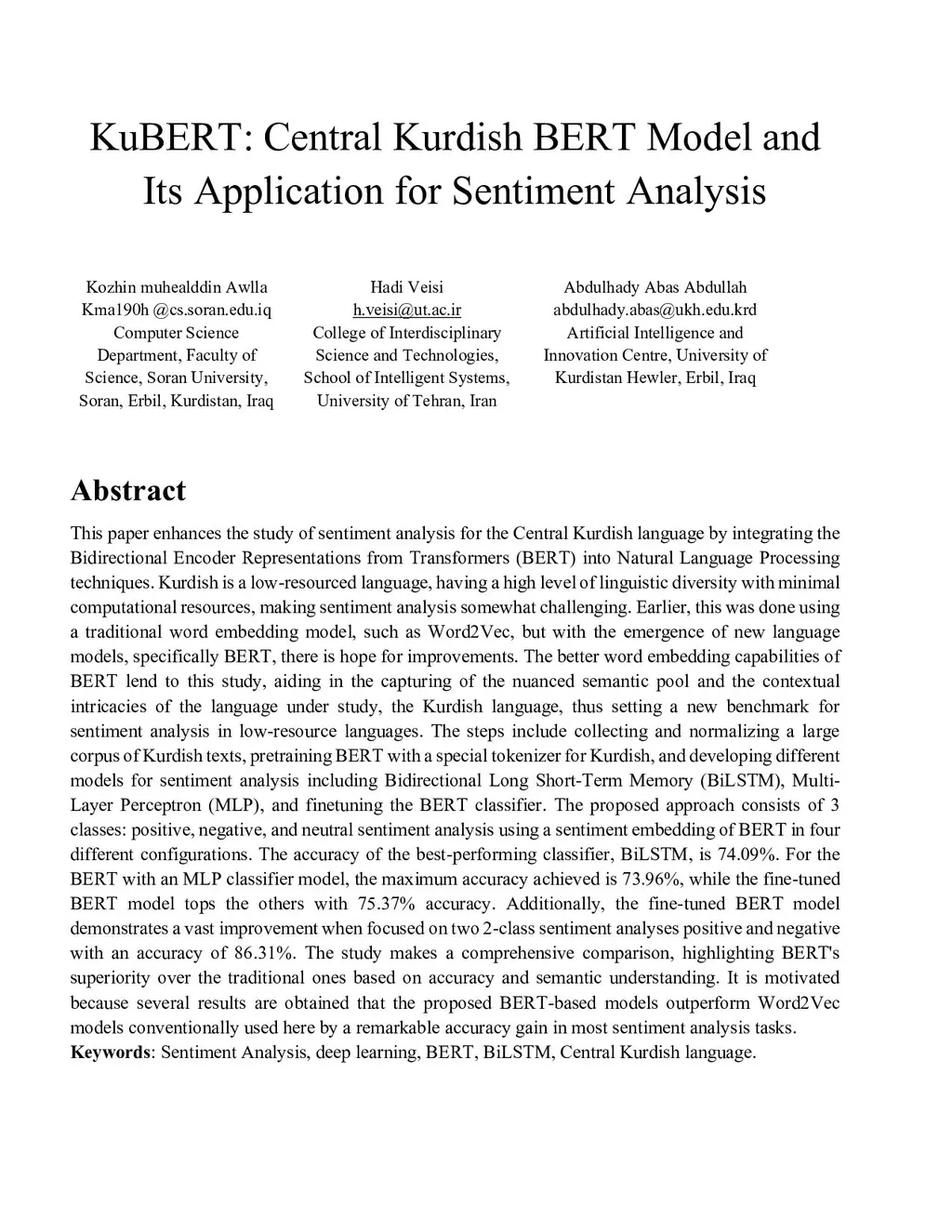 KuBERT: Central Kurdish BERT Model and Its Application for Sentiment Analysis