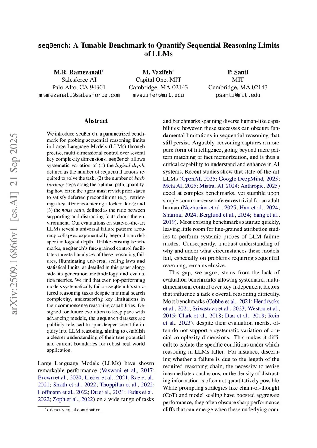We introduce seqBench, a parametrized benchmark for probing sequential reasoning limits in Large Language Models (LLMs) through precise, multi-dimensional control over several key complexity dimensions. seqBench allows systematic variation of (1) the logical depth, defined as the number of sequential actions required to solve the task; (2) the number of backtracking steps along the optimal path, quantifying how often the agent must revisit prior states to satisfy deferred preconditions (e.g., retrieving a key after encountering a locked door); and (3) the noise ratio, defined as the ratio between supporting and distracting facts about the environment. Our evaluations on state-of-the-art LLMs reveal a universal failure pattern: accuracy collapses exponentially beyond a model-specific logical depth. Unlike existing benchmarks, seqBench's fine-grained control facilitates targeted analyses of these reasoning failures, illuminating universal scaling laws and statistical limits, as detailed in this paper alongside its generation methodology and evaluation metrics. We find that even top-performing models systematically fail on seqBench's structured reasoning tasks despite minimal search complexity, underscoring key limitations in their commonsense reasoning capabilities. Designed for future evolution to keep pace with advancing models, the seqBench datasets are publicly released to spur deeper scientific inquiry into LLM reasoning, aiming to establish a clearer understanding of their true potential and current boundaries for robust real-world application.