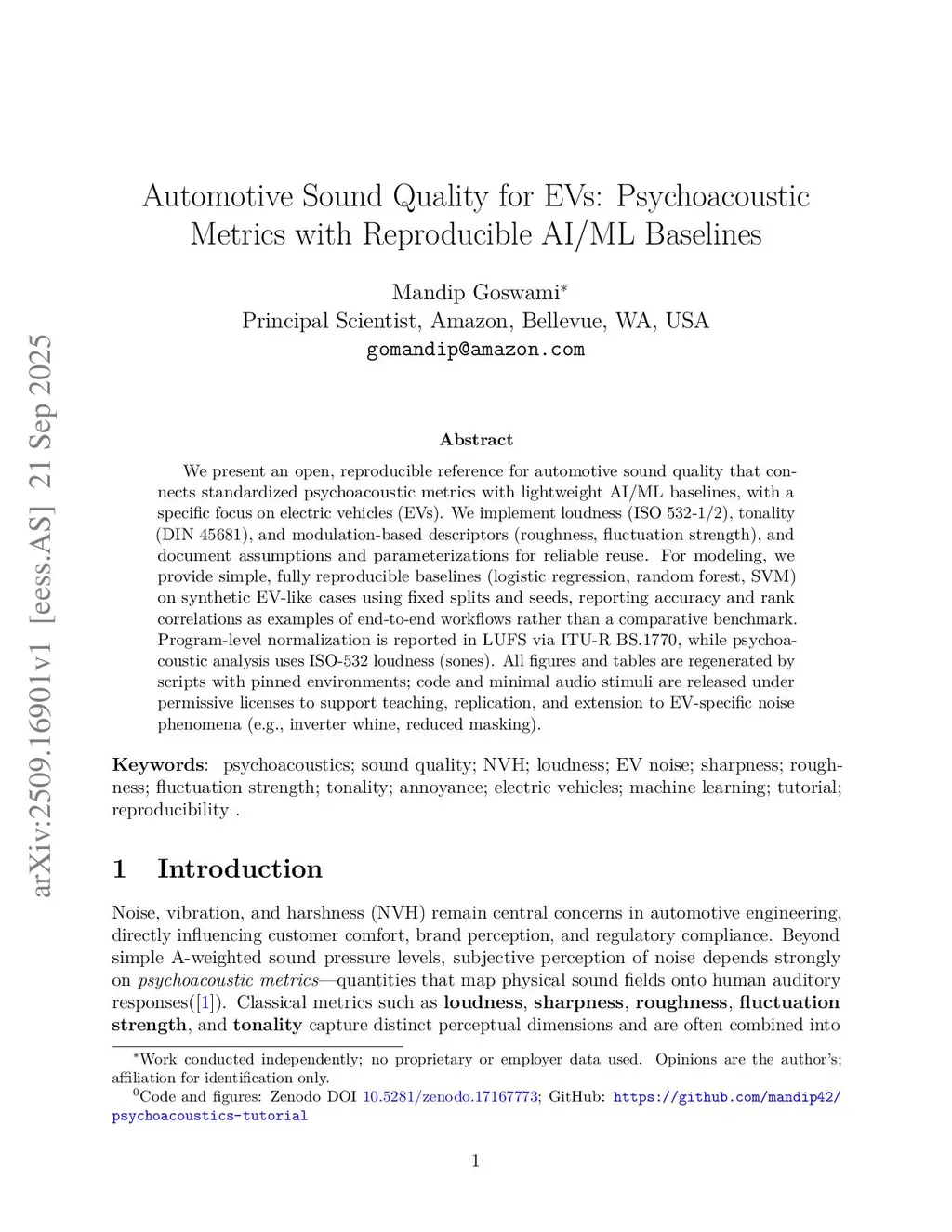 We present an open, reproducible reference for automotive sound quality that connects standardized psychoacoustic metrics with lightweight AI/ML baselines, with a specific focus on electric vehicles (EVs). We implement loudness (ISO 532-1/2), tonality (DIN 45681), and modulation-based descriptors (roughness, fluctuation strength), and document assumptions and parameterizations for reliable reuse. For modeling, we provide simple, fully reproducible baselines (logistic regression, random forest, SVM) on synthetic EV-like cases using fixed splits and seeds, reporting accuracy and rank correlations as examples of end-to-end workflows rather than a comparative benchmark. Program-level normalization is reported in LUFS via ITU-R BS.1770, while psychoacoustic analysis uses ISO-532 loudness (sones). All figures and tables are regenerated by scripts with pinned environments; code and minimal audio stimuli are released under permissive licenses to support teaching, replication, and extension to EV-specific noise phenomena (e.g., inverter whine, reduced masking).