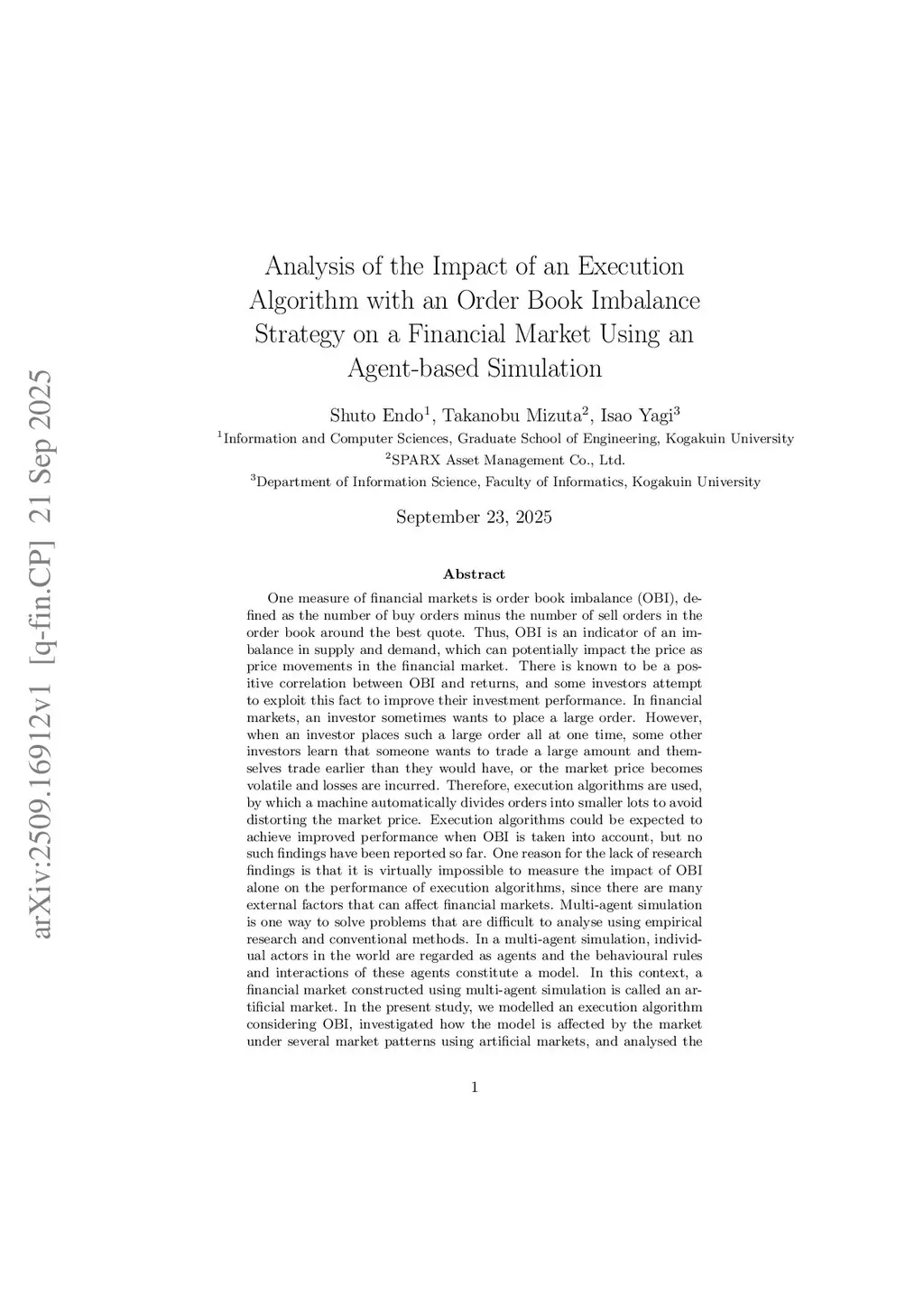 Order book imbalance (OBI) - buy orders minus sell orders near the best quote - measures supply-demand imbalance that can move prices. OBI is positively correlated with returns, and some investors try to use it to improve performance. Large orders placed at once can reveal intent, invite front-running, raise volatility, and cause losses. Execution algorithms therefore split parent orders into smaller lots to limit price distortion. In principle, using OBI inside such algorithms could improve execution, but prior evidence is scarce because isolating OBI's effect in real markets is nearly impossible amid many external factors.Multi-agent simulation offers a way to study this. In an artificial market, individual actors are agents whose rules and interactions form the model. This study builds an execution algorithm that accounts for OBI, tests it across several market patterns in artificial markets, and analyzes mechanisms, comparing it with a conventional (OBI-agnostic) algorithm.Results: (i) In stable markets, the OBI strategy's performance depends on the number of order slices; outcomes vary with how the parent order is partitioned. (ii) In markets with unstable prices, the OBI-based algorithm outperforms the conventional approach. (iii) Under spoofing manipulation, the OBI strategy is not significantly worse than the conventional algorithm, indicating limited vulnerability to spoofing.Overall, OBI provides a useful signal for execution. Incorporating OBI can add value - especially in volatile conditions - while remaining reasonably robust to spoofing; in calm markets, benefits are sensitive to slicing design.