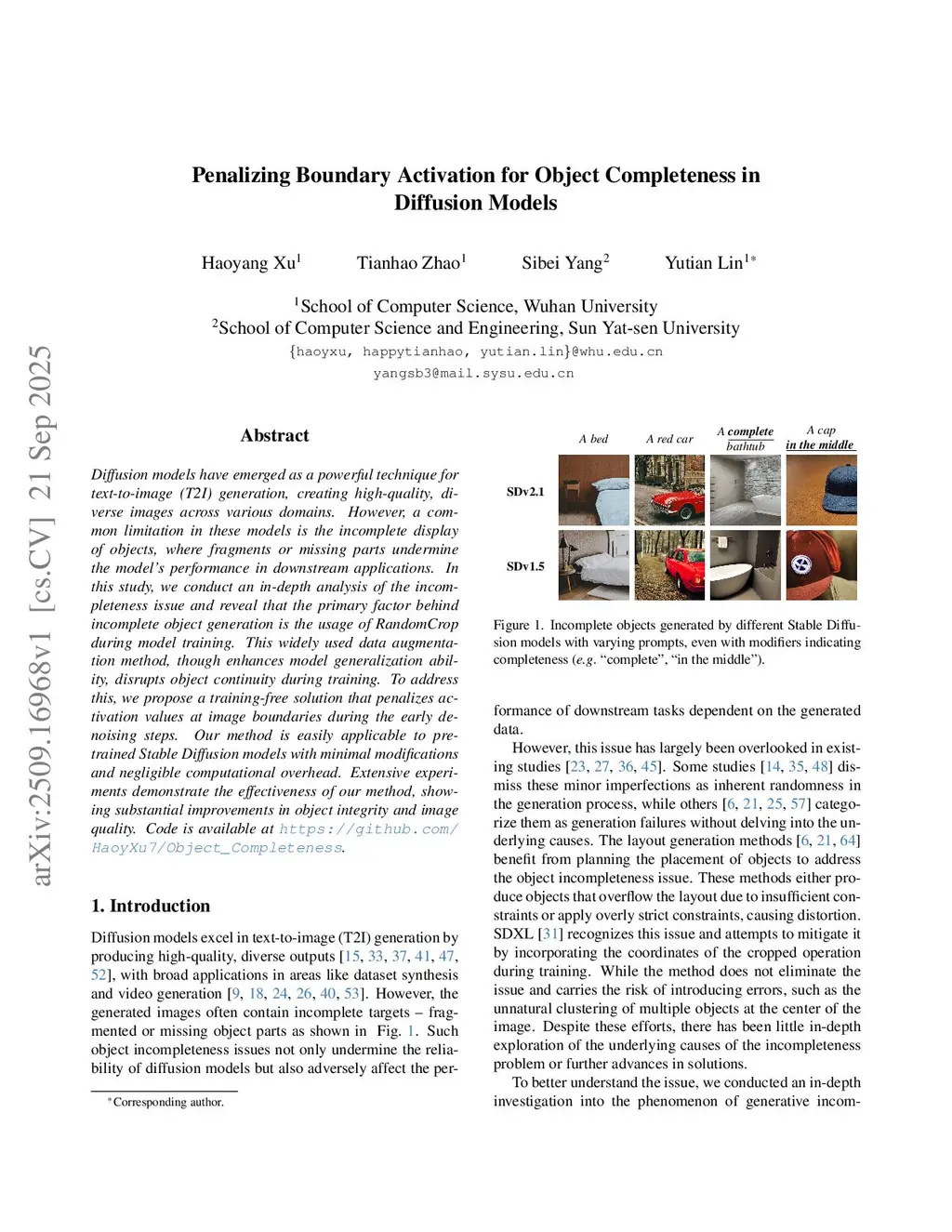 Diffusion models have emerged as a powerful technique for text-to-image (T2I) generation, creating high-quality, diverse images across various domains. However, a common limitation in these models is the incomplete display of objects, where fragments or missing parts undermine the model's performance in downstream applications. In this study, we conduct an in-depth analysis of the incompleteness issue and reveal that the primary factor behind incomplete object generation is the usage of RandomCrop during model training. This widely used data augmentation method, though enhances model generalization ability, disrupts object continuity during training. To address this, we propose a training-free solution that penalizes activation values at image boundaries during the early denoising steps. Our method is easily applicable to pre-trained Stable Diffusion models with minimal modifications and negligible computational overhead. Extensive experiments demonstrate the effectiveness of our method, showing substantial improvements in object integrity and image quality.