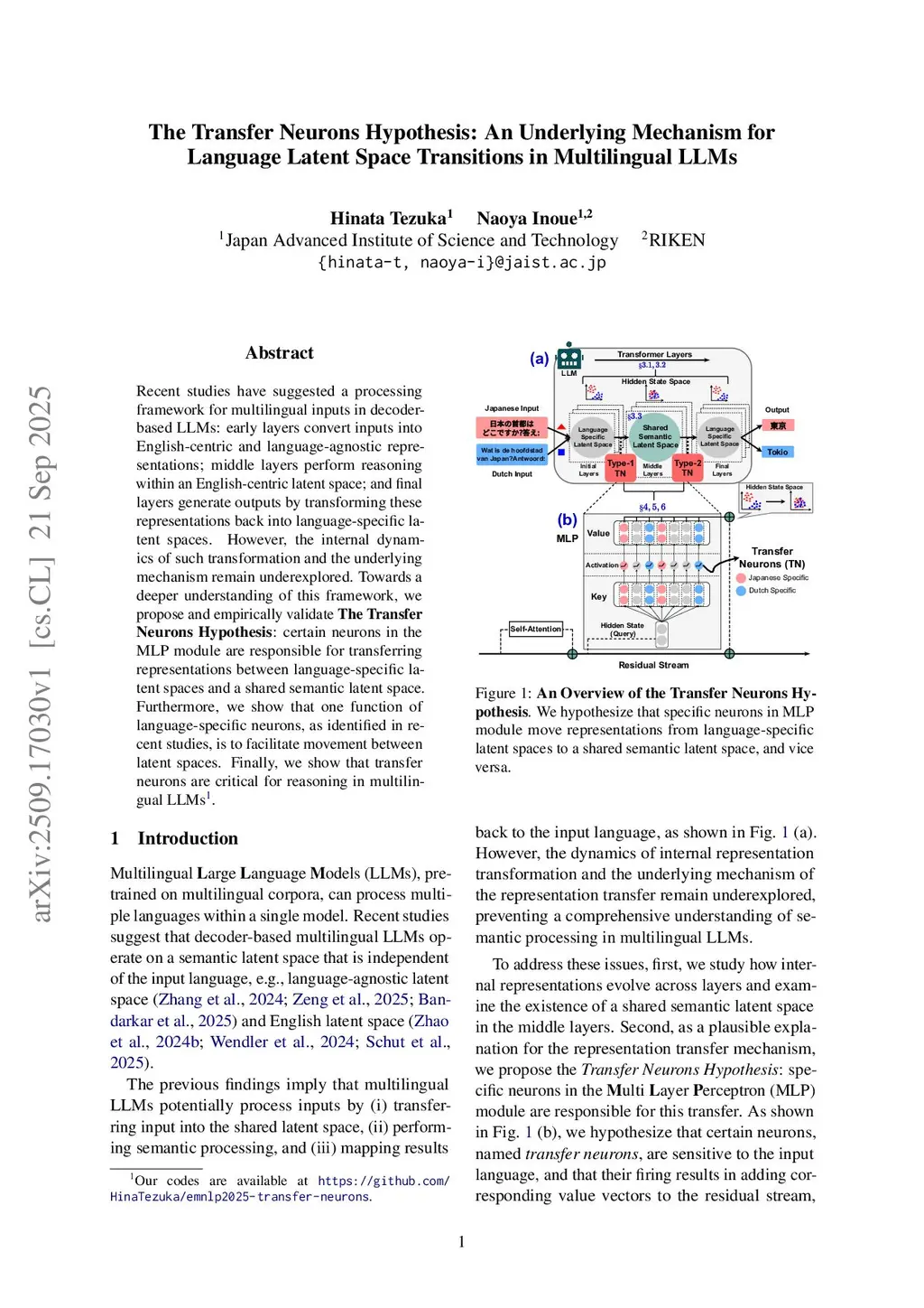The Transfer Neurons Hypothesis: An Underlying Mechanism for Language Latent Space Transitions in Multilingual LLMs
