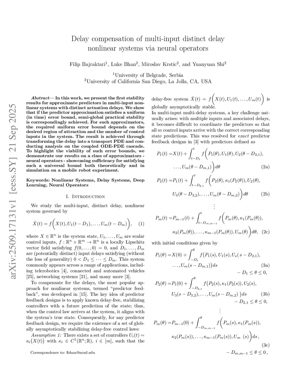 In this work, we present the first stability results for approximate predictors in multi-input non-linear systems with distinct actuation delays. We show that if the predictor approximation satisfies a uniform (in time) error bound, semi-global practical stability is correspondingly achieved. For such approximators, the required uniform error bound depends on the desired region of attraction and the number of control inputs in the system. The result is achieved through transforming the delay into a transport PDE and conducting analysis on the coupled ODE-PDE cascade. To highlight the viability of such error bounds, we demonstrate our results on a class of approximators - neural operators - showcasing sufficiency for satisfying such a universal bound both theoretically and in simulation on a mobile robot experiment.